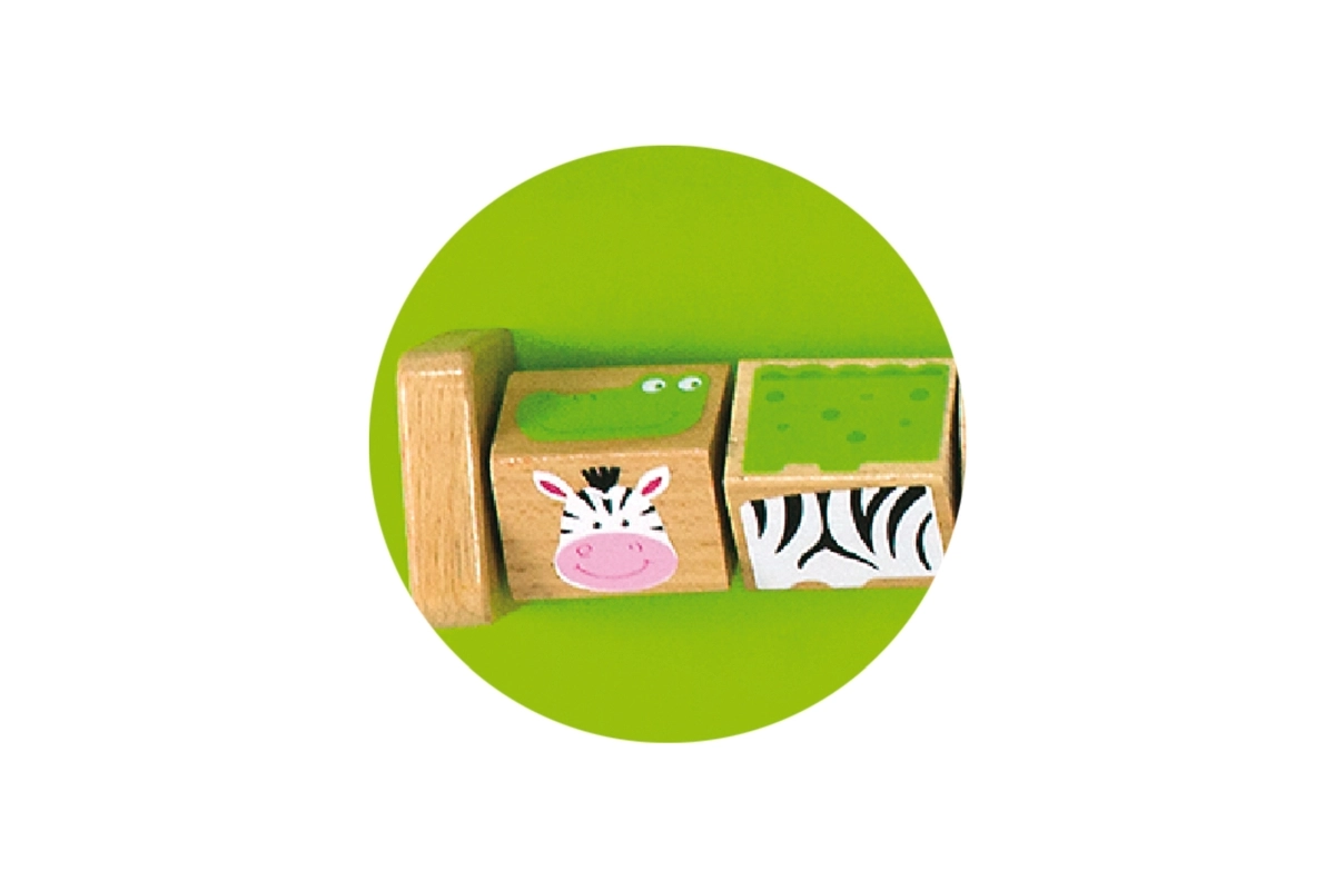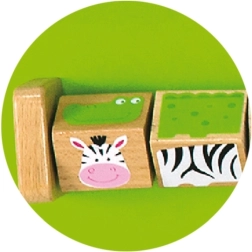 Tris prizmes su gyvūnų iliustracijomis vaikai suka ir dėlioja į teisingą paveikslėlį – lavina logiką, kantrybę ir vizualinį suvokimą.