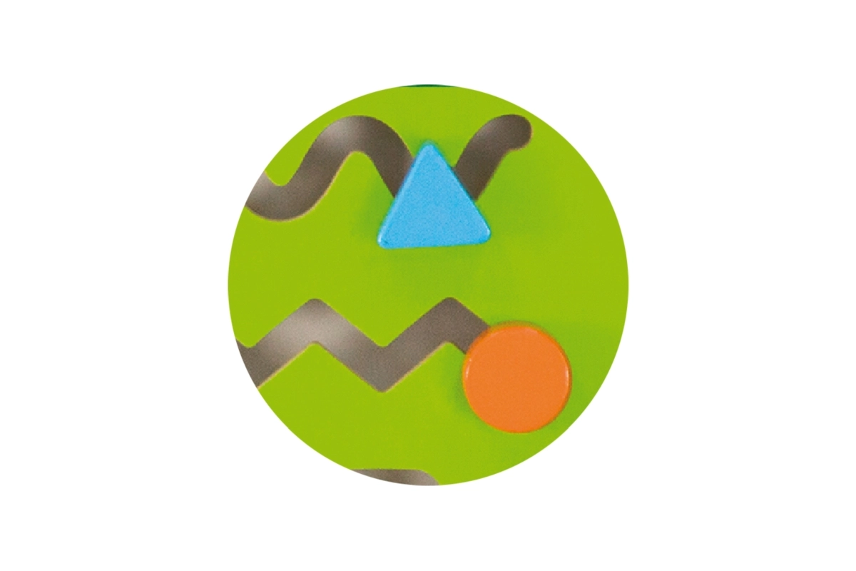 Vaikai stumia trikampį, apskritimą ir kvadratą dantytais ir vingiuotais takeliais, taip treniruodami koordinaciją, tikslumą ir formų atpažinimą.
