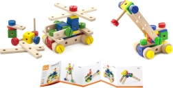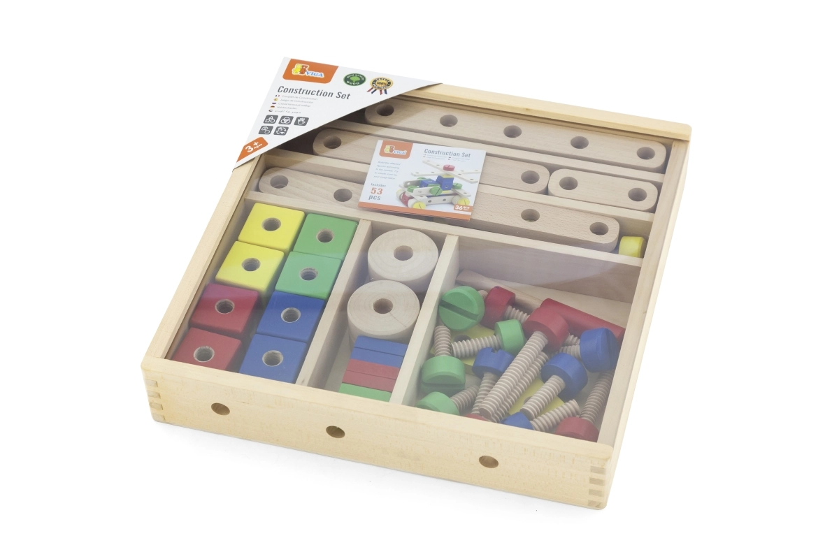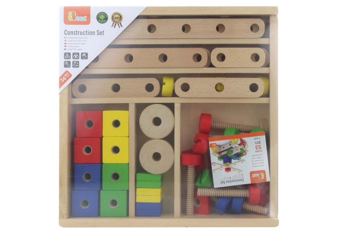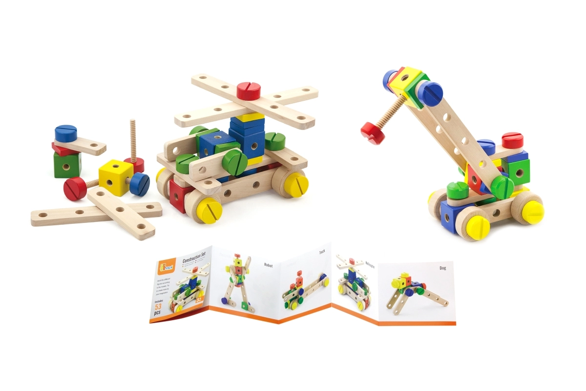Atraskite linksmą ir edukacinę medinę konstruktoriaus kaladėlių rinktinę su 53 detalėmis ir iliustruota brošiūra, palengvinančia statybą. Skatina smulkiąją motoriką, kūrybiškumą ir erdvinį mąstymą. Idealu vaikams nuo 3 metų, laikoma patogiame dėkle, kurio matmenys 31 × 31 × 5,5 cm.