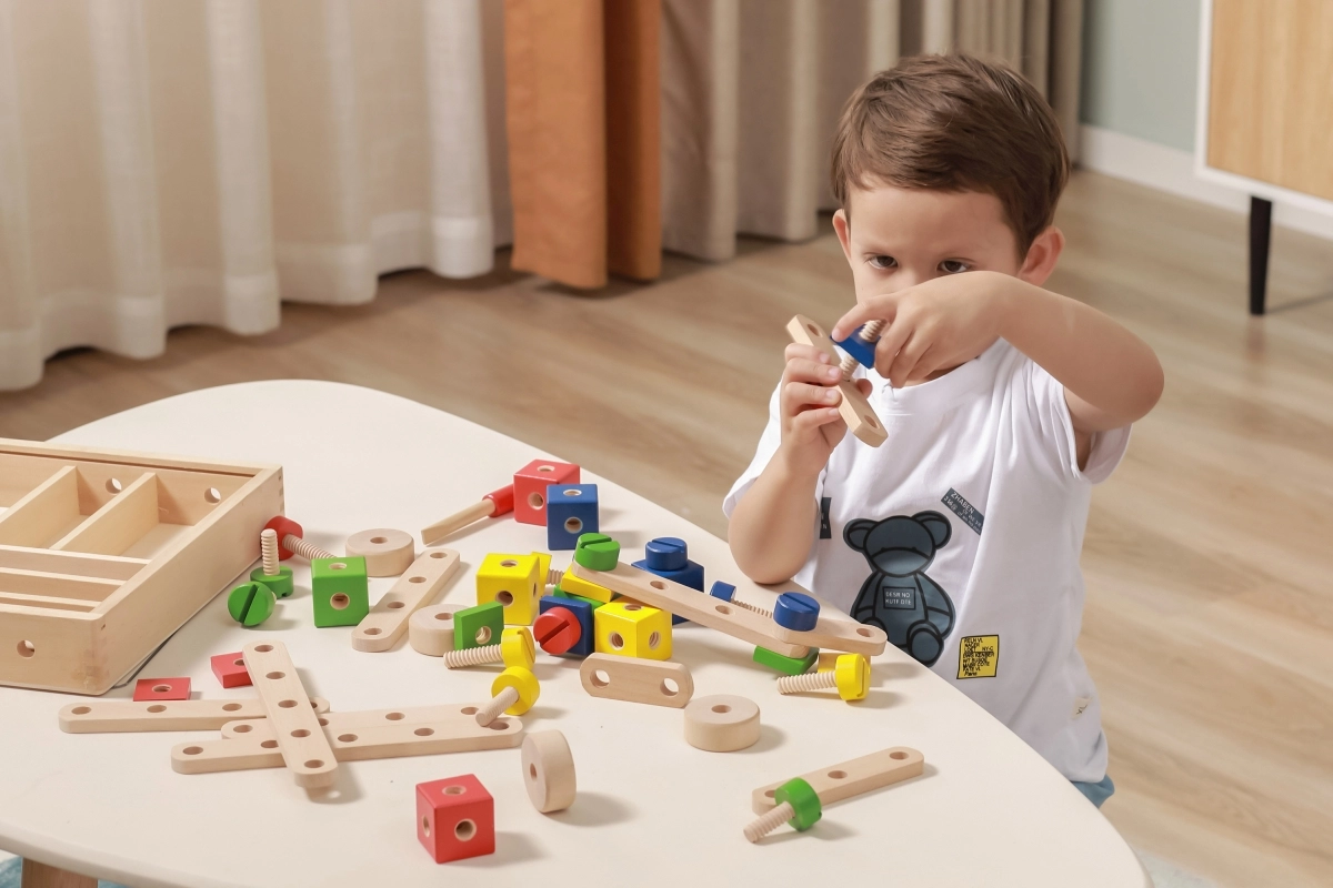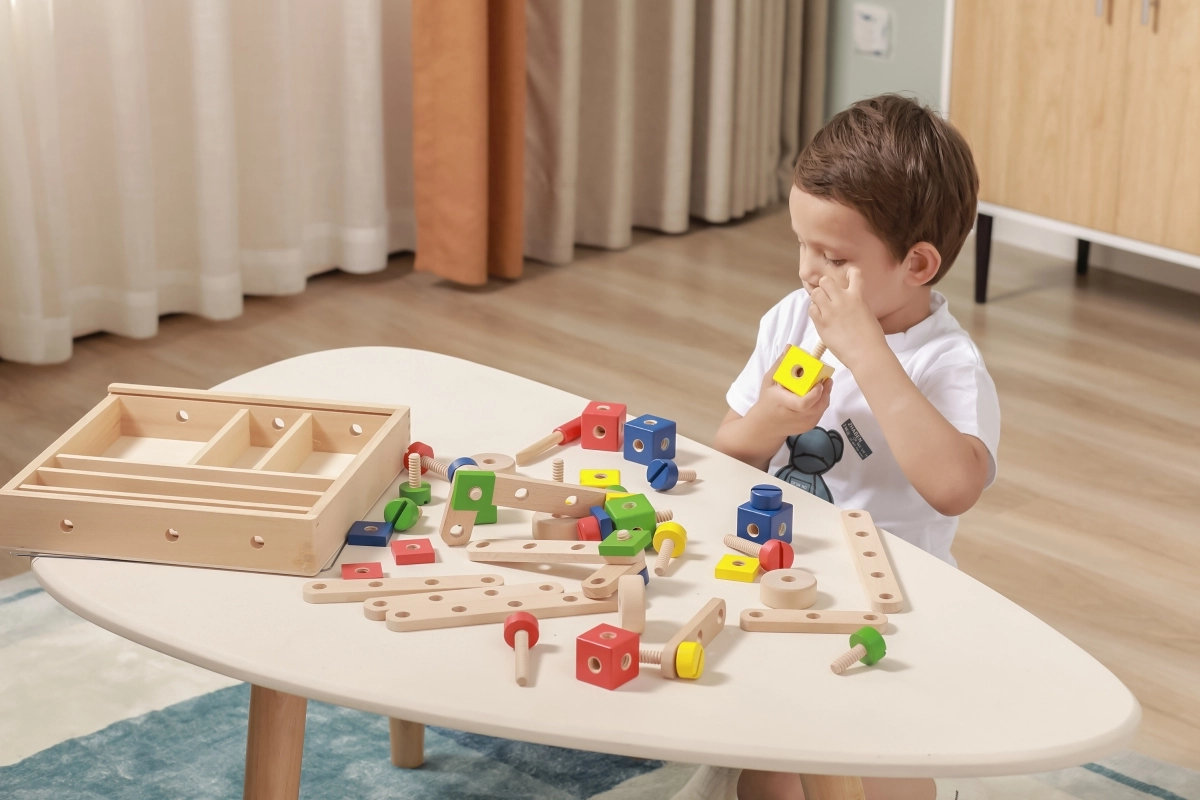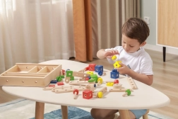 Rinkinys lavina smulkiąją motoriką, akių–rankų koordinaciją, loginį ir erdvinį mąstymą. Natūrali mediena kartu su ryškiomis spalvomis vilioja žaisti ir mokytis per pramogą. Viskas tvarkingai laikoma dėkle su permatomu dangteliu, kad detales būtų lengva susitvarkyti ir jos visada būtų po ranka.