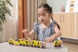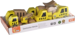 Ši kokybiška rinktinė apima 6 skirtingas statybines transporto priemones ryškiai geltonos spalvos su natūralaus medžio detalėmis – idealiai tinka pirmiesiems „lenktynių“ važiavimams grindimis ir statybvietės vaidmenų žaidimams. Dėl apvalintų formų ir patvarios medinės konstrukcijos automobiliai yra saugūs ir malonūs liesti.