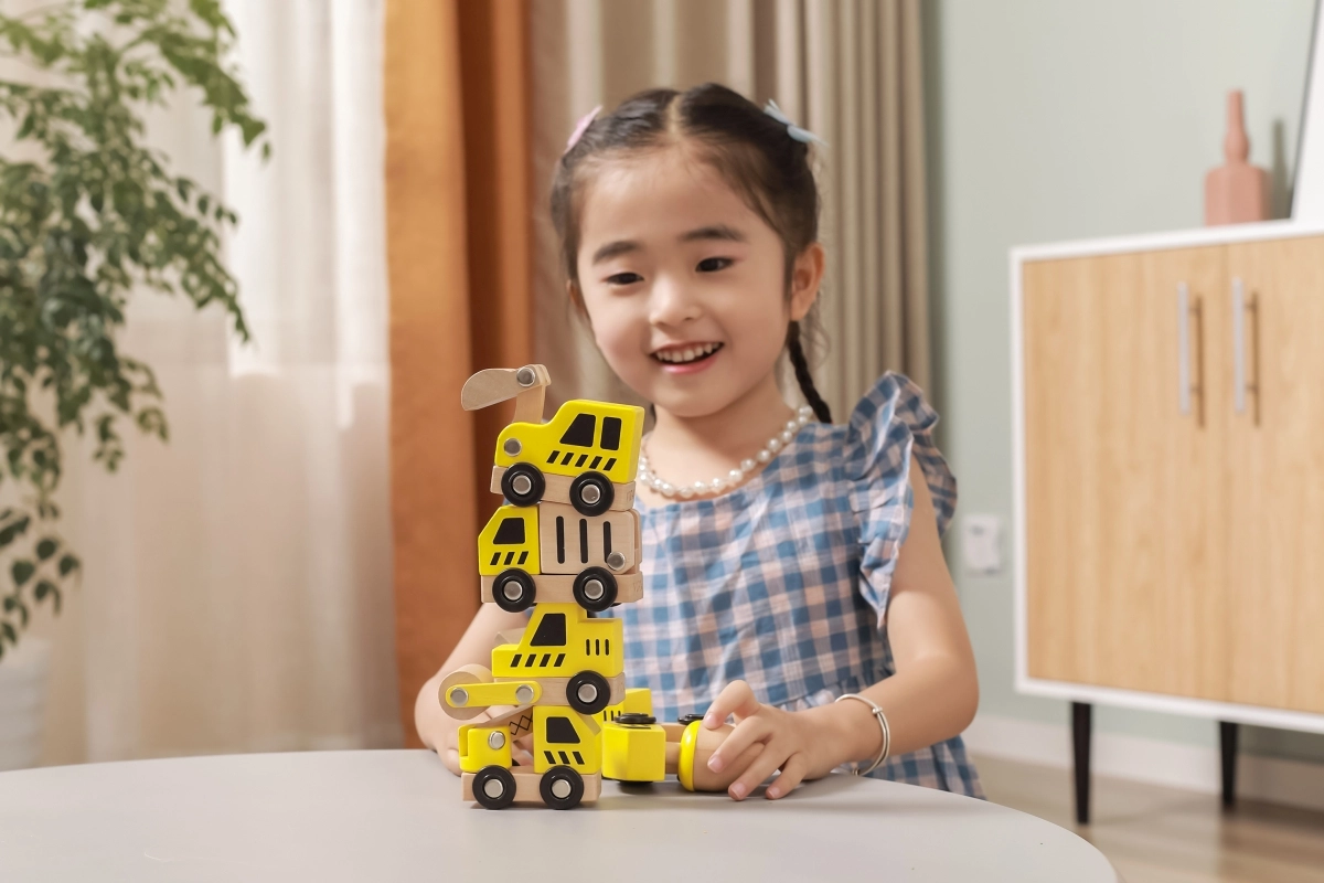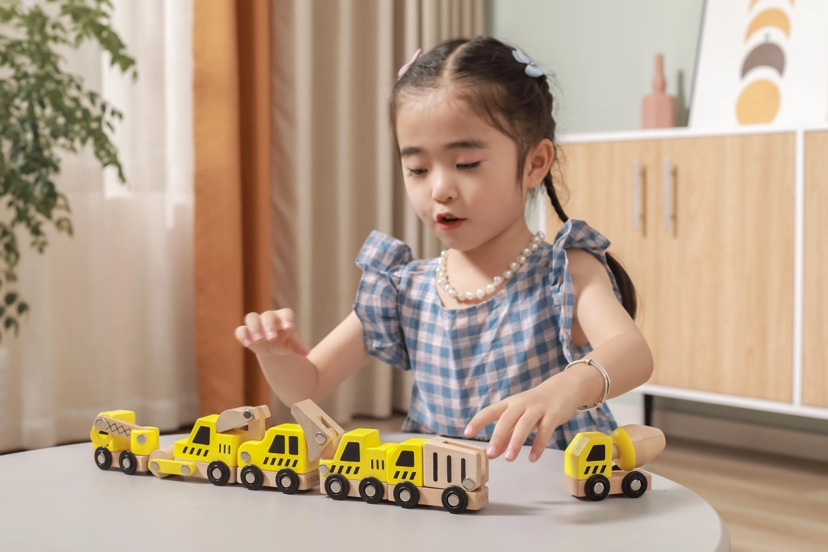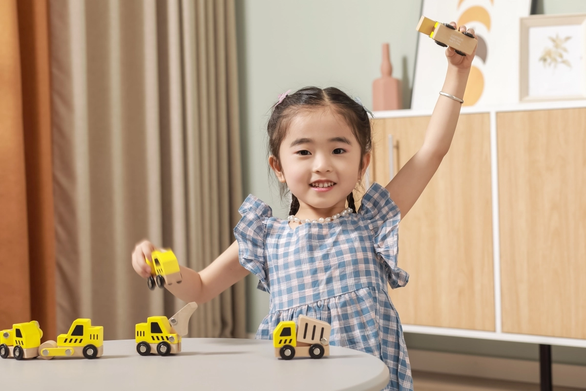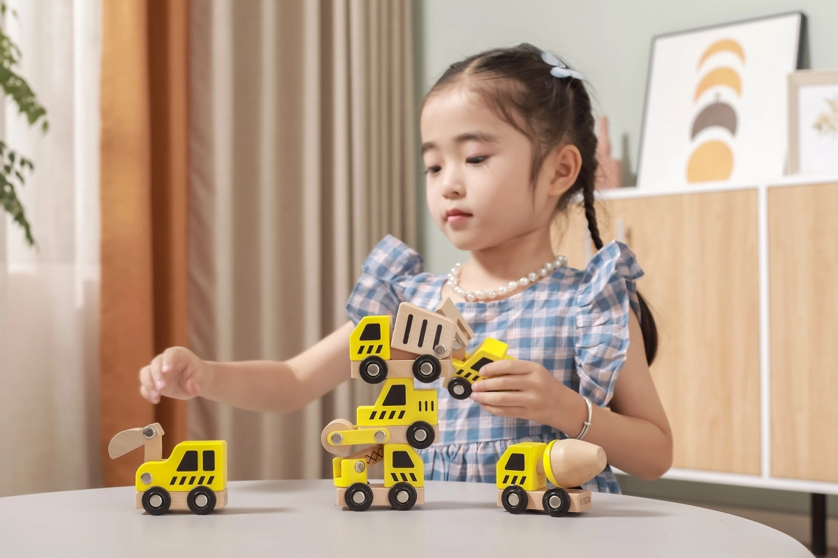 Kiekviena transporto priemonė turi funkcinius ratelius, kad sklandžiai riedėtų, o kai kurios detalės imituoja judančius elementus (pvz., kaušą, maišyklę ar kraną), kas skatina natūralų smalsumą ir akies-rankos koordinacijos lavinimą.