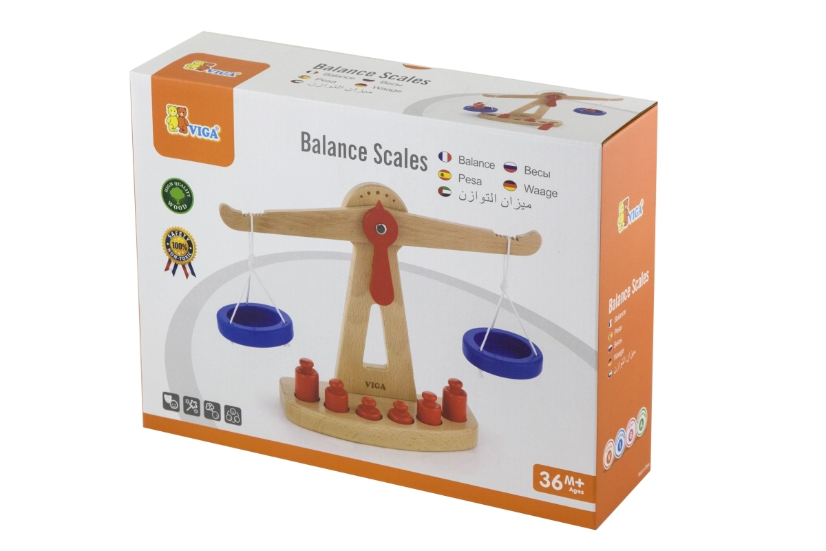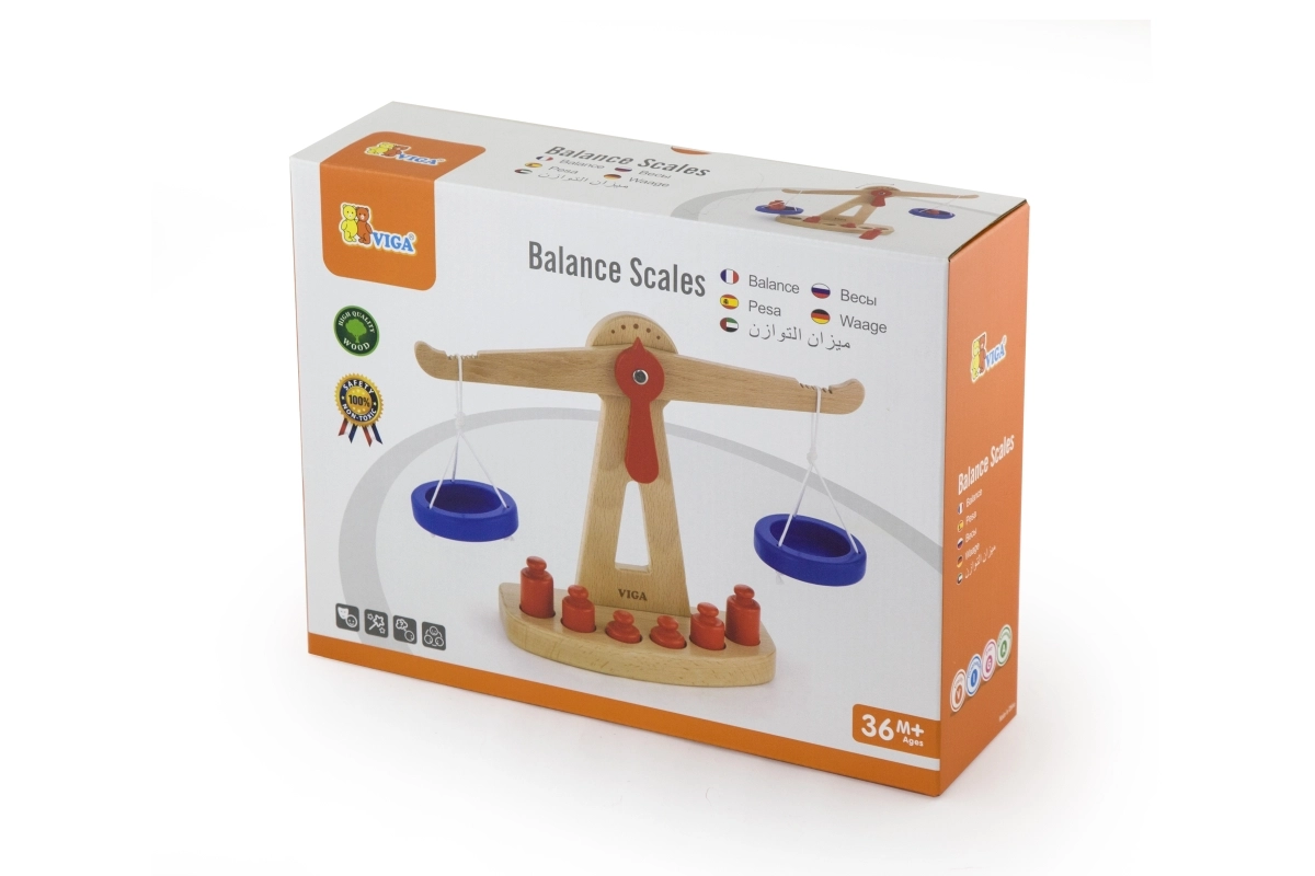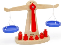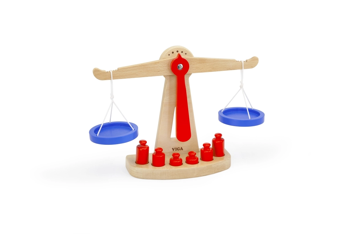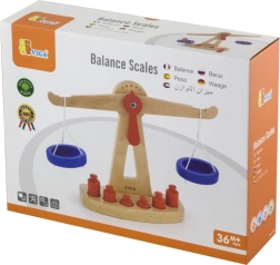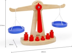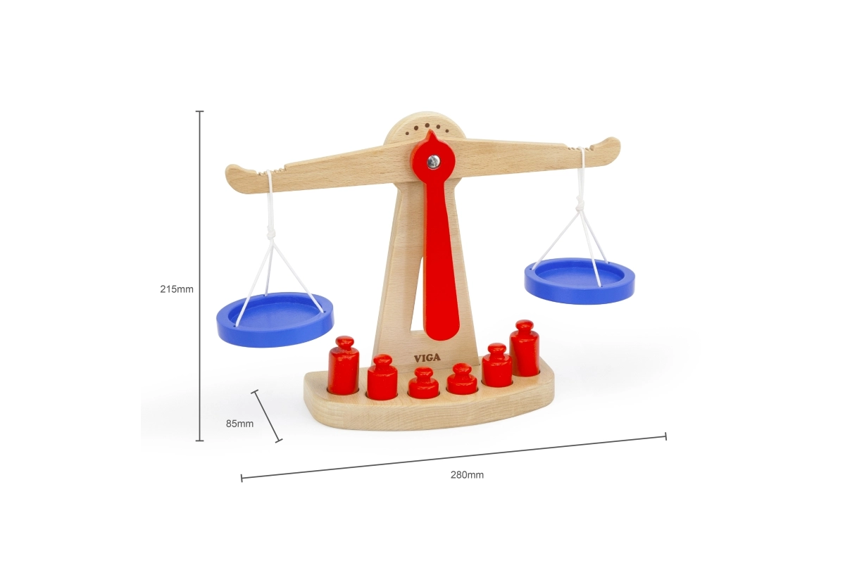 Medinės balansinės Viga svarstyklės turi dvi mėlynas lėkštes, pakabintas ant virvelių, ir šešis raudonus skirtingų dydžių svarelius. Dėl savo spalvingo dizaino ir saugios apdailos šios svarstyklės suteikia vaikams daug džiaugsmo. Svarstyklės sukurtos taip, kad skatintų vaikus pasitelkti vaizduotę ir fantaziją žaidžiant „parduotuvę“, o tai padeda suprasti pagrindines matematines sąvokas ir pusiausvyros svarbą.
