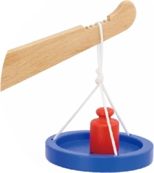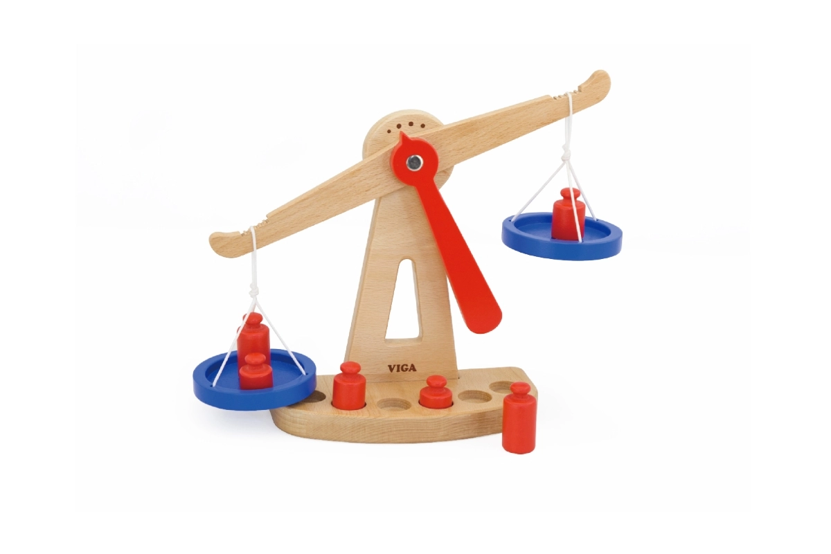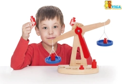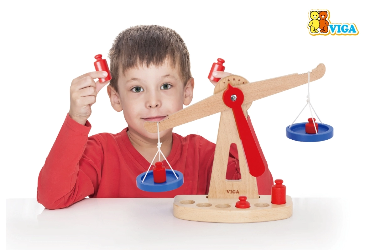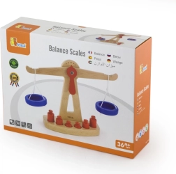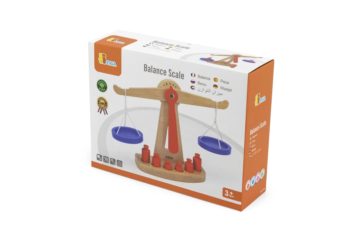 Medinės balansinės Viga svarstyklės turi dvi mėlynas lėkštes, pakabintas ant virvelių, ir šešis raudonus skirtingų dydžių svarelius. Dėl savo spalvingo dizaino ir saugios apdailos šios svarstyklės suteikia vaikams daug džiaugsmo. Svarstyklės sukurtos taip, kad skatintų vaikus pasitelkti vaizduotę ir fantaziją žaidžiant „parduotuvę“, o tai padeda suprasti pagrindines matematines sąvokas ir pusiausvyros svarbą.