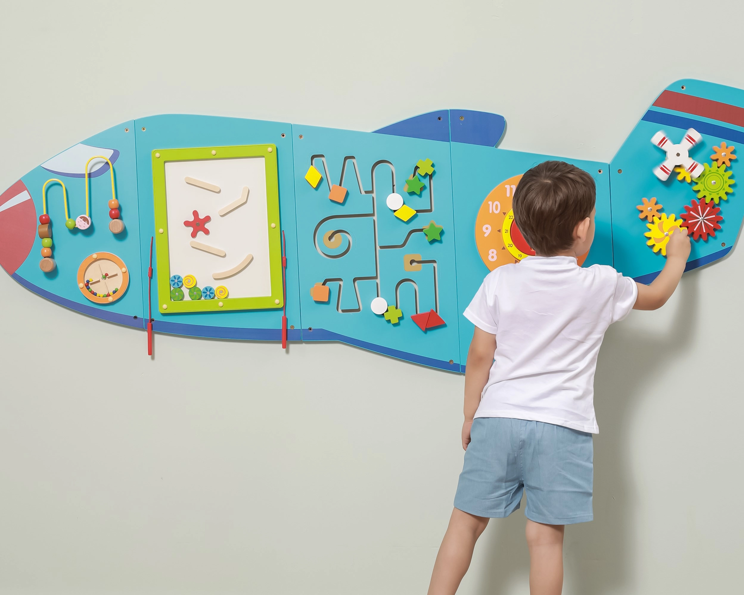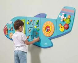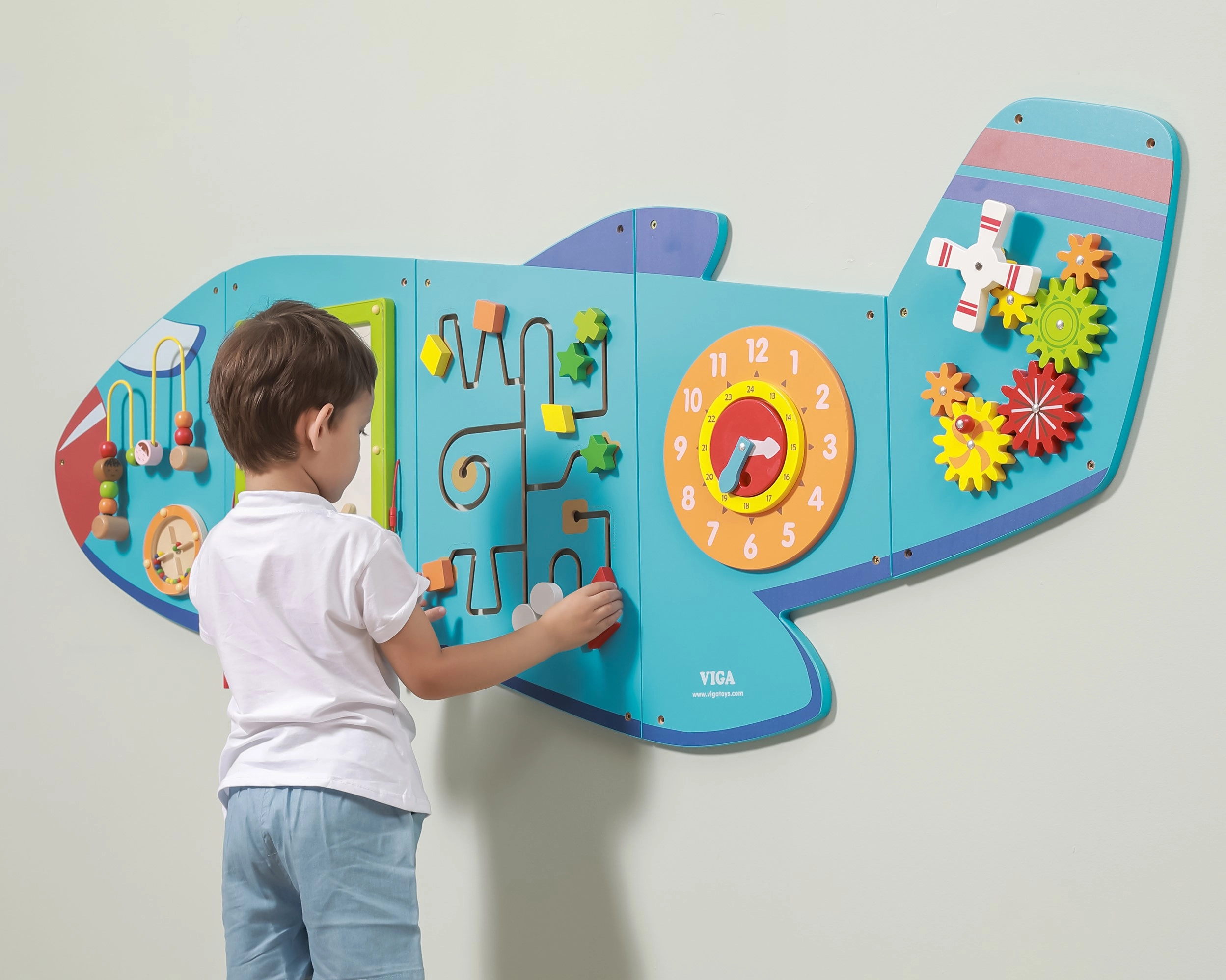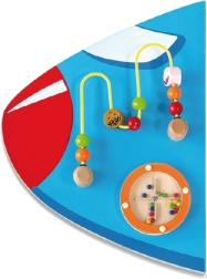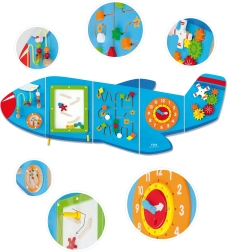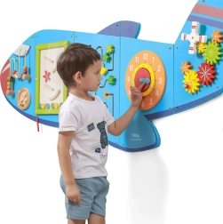 Medinė sieninė lenta Lėktuvas iš VIGA yra daugiafunkcis žaislas, sudarytas iš penkių dalių, kurios kartu sudaro lėktuvo formą. Kiekvienas elementas siūlo skirtingą veiklą smagiam vaikų įgūdžių lavinimui: