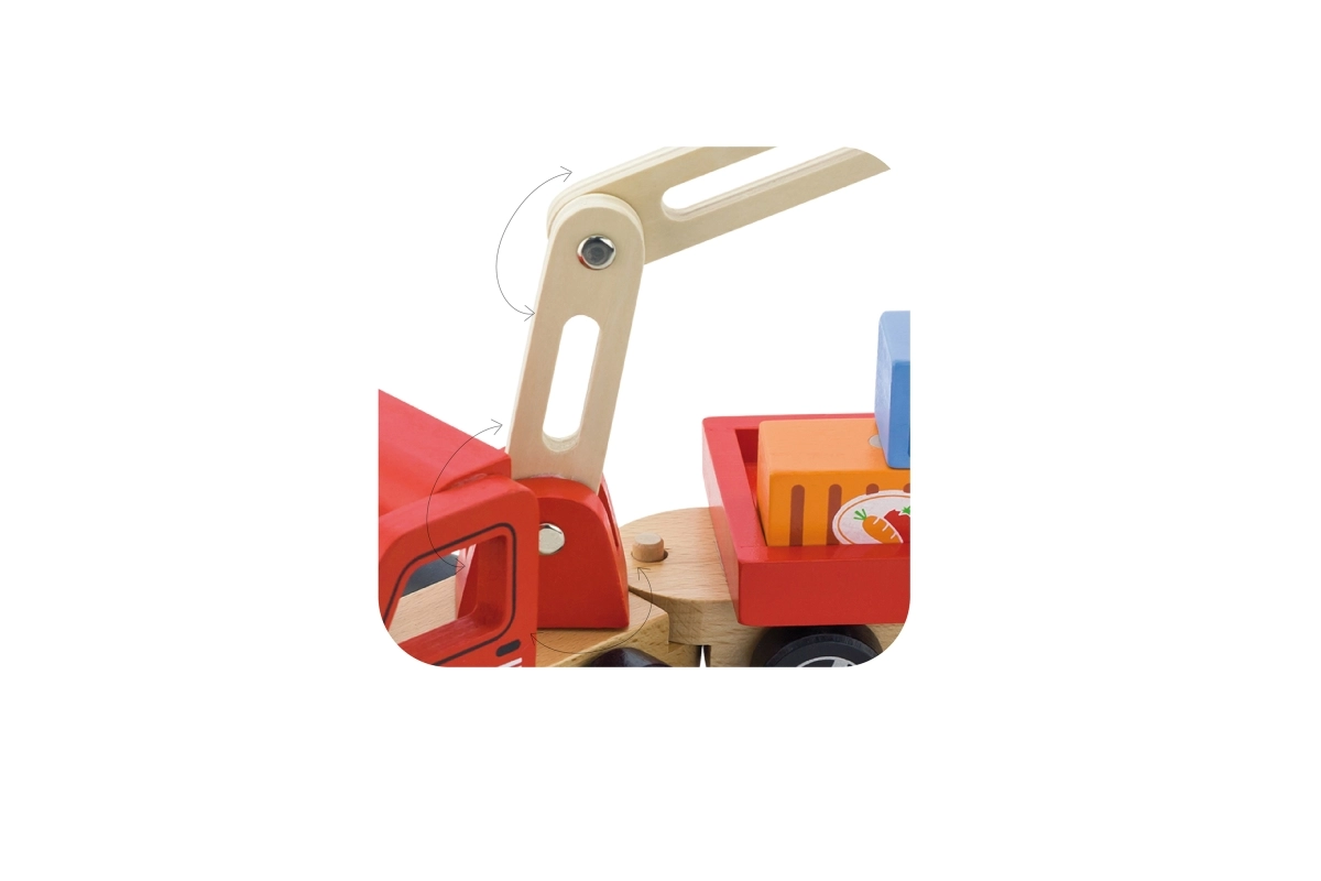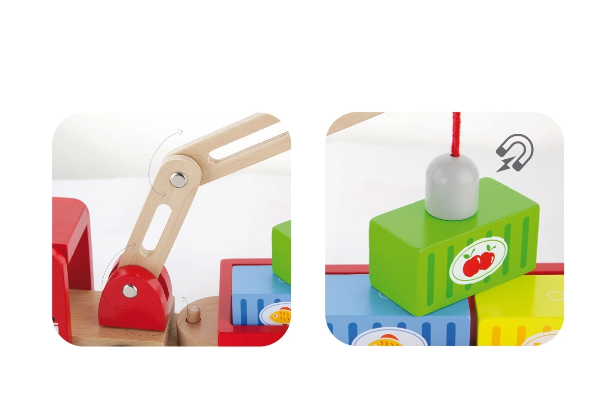Spalvingas krano su konteineriais dizainas džiugina akį ir skatina žaismingą veiklą. Nuimama priekaba suteikia žaidimui įvairumo ir skatina vaikų kūrybiškumą.