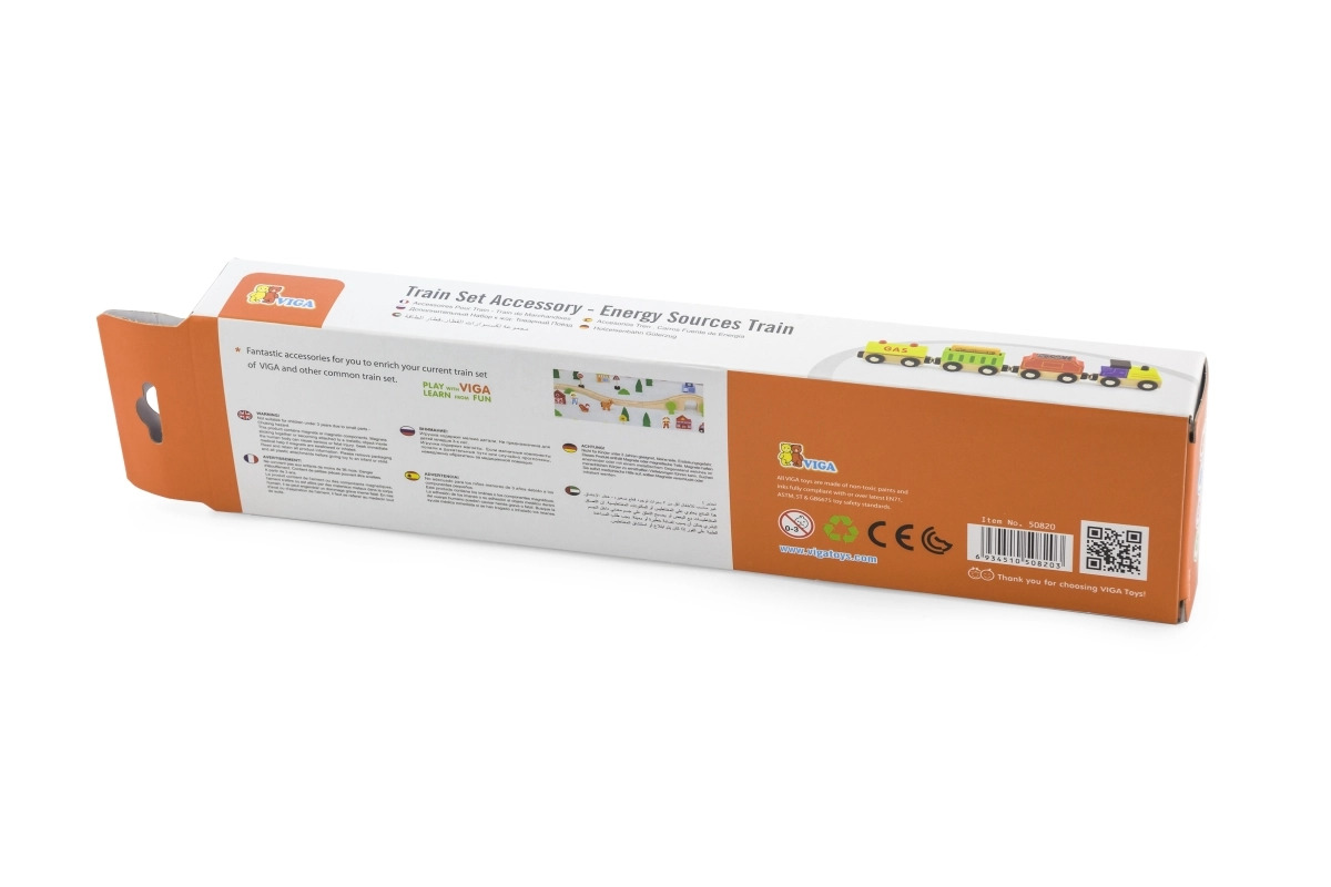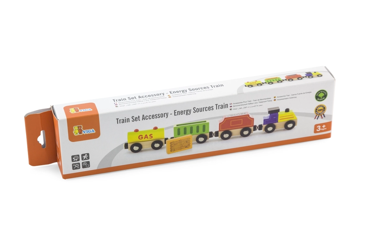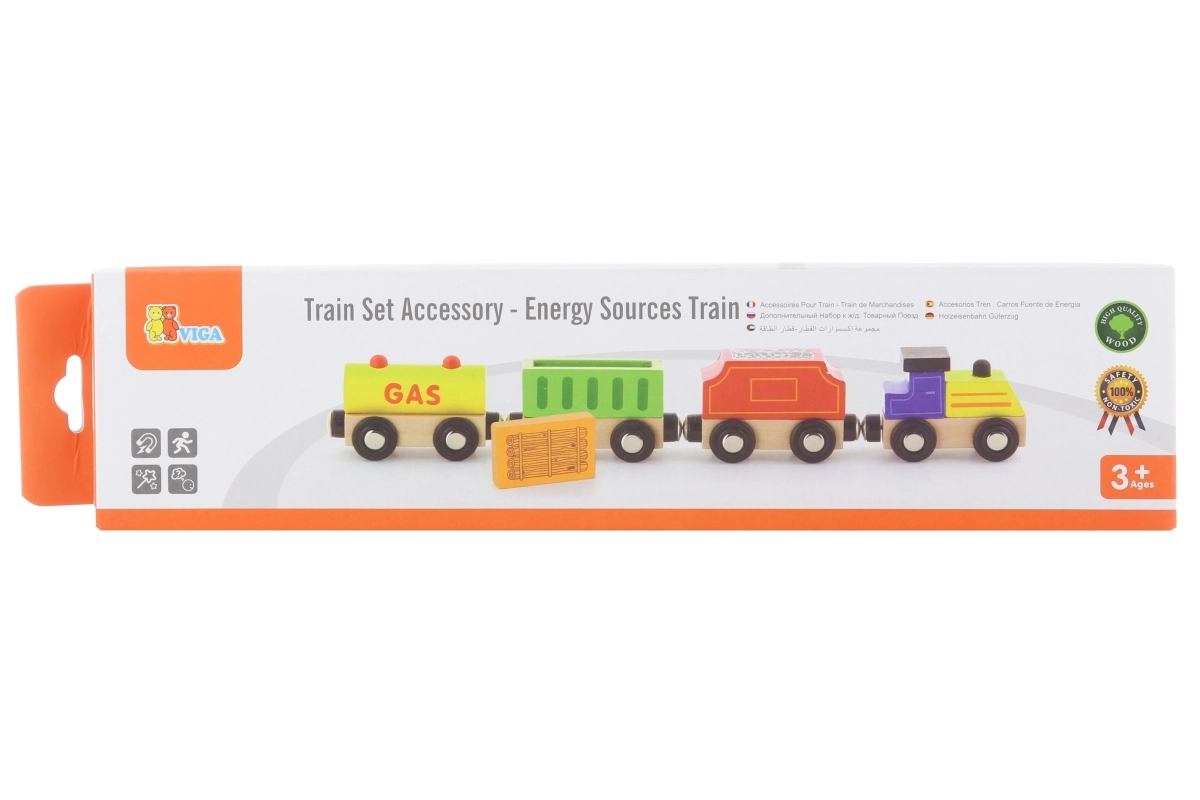 VIGA traukinukas energijos šaltinių tema suteikia daug pramogų ir mokymosi. Rinkinyje yra lokomotyvas ir trys skirtingi vagonai (pvz., cisterna, krovininis ir anglių vagonas), kuriuos vaikai lengvai sujungia magnetais. Kokybiškas medinis apdirbimas ir ryškus dizainas kviečia žaisti ir lavina vaizduotę.