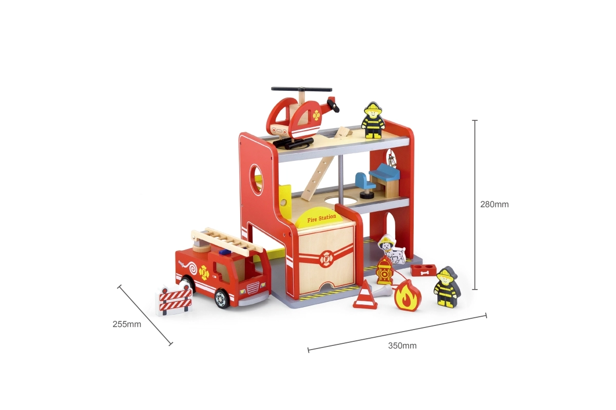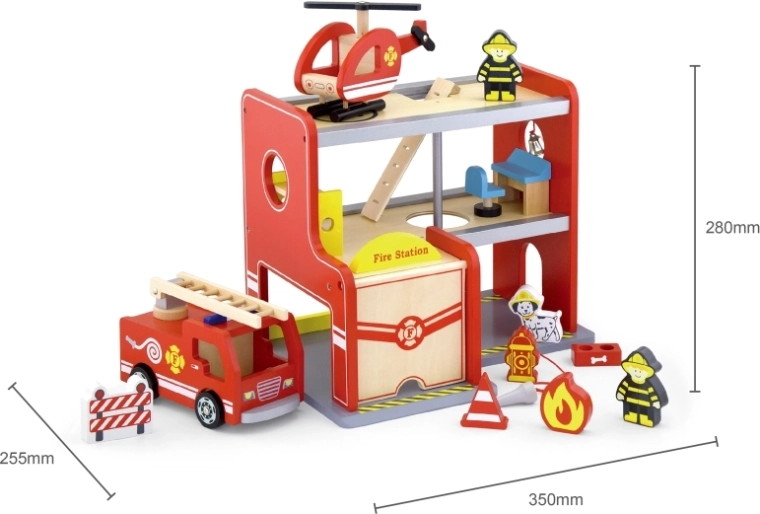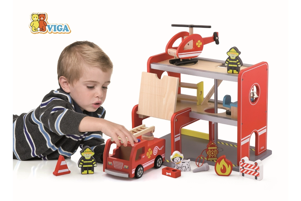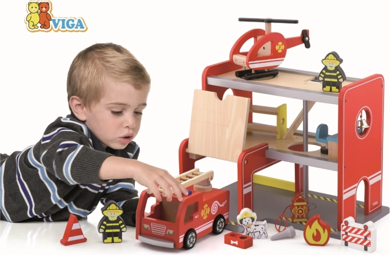 Medinė gaisrinės stotis Viga – tai pilnas kelių aukštų žaidimų rinkinys, skatinantis vaidmenų žaidimus, smulkiąją motoriką ir vaizduotę. Vaikai gali išvažiuoti iš garažo automobiliu, leistis sraigtasparniu ant viršutinės aikštelės ir čiuožti vamzdžiu tiesiai į iškvietimą. Ryškios detalės ir kokybiška medinė konstrukcija užtikrina patrauklią išvaizdą ir atsparumą kasdieniam naudojimui.