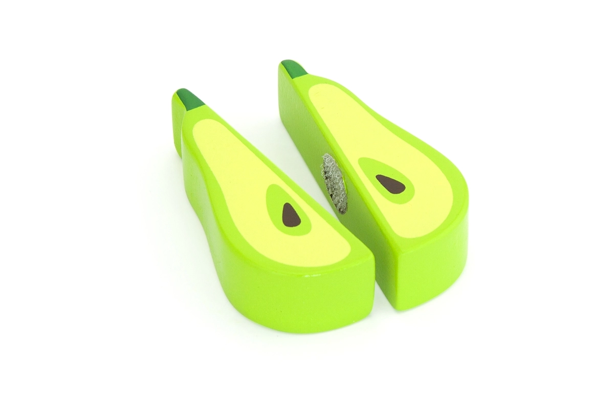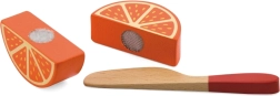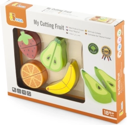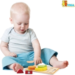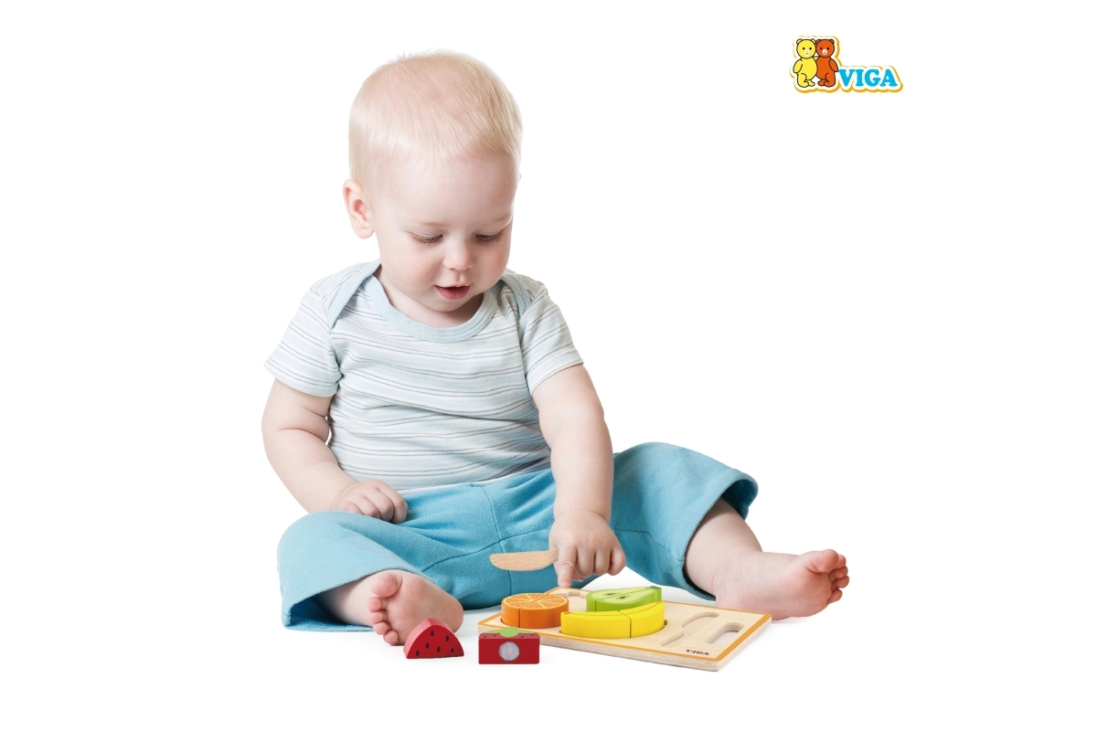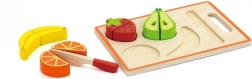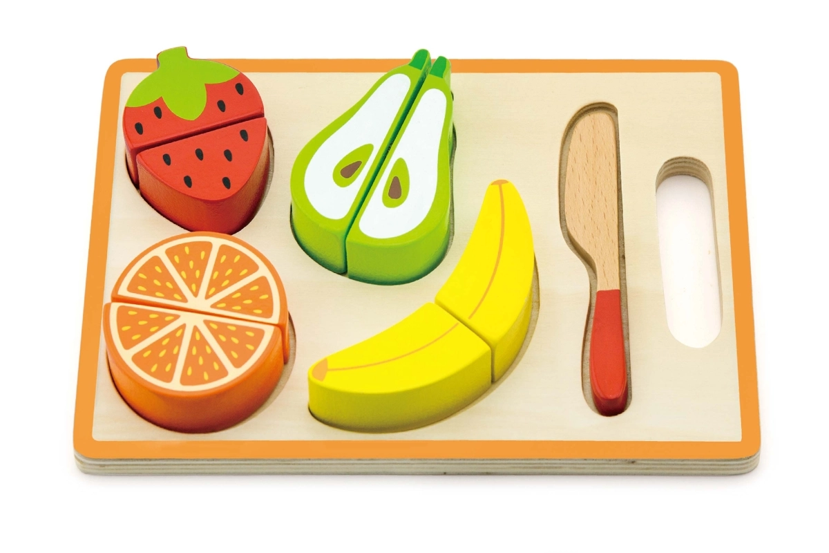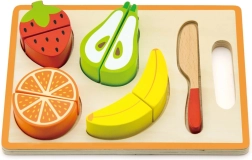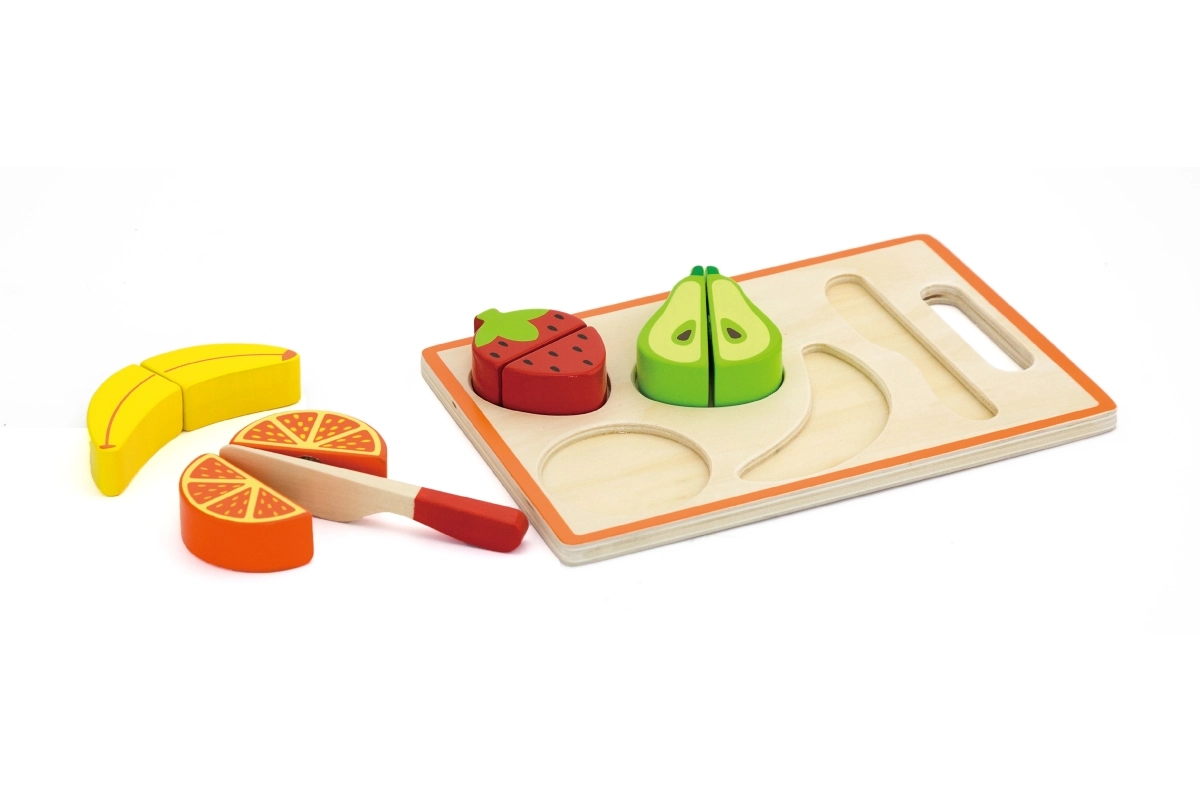 Linksmas ir saugus medinis vaisių pjaustymo rinkinys patiems mažiausiems lavina smulkiąją motoriką, akių–rankų koordinaciją ir skatina vaidmenų žaidimus virtuvėje. Ryškiaspalviai vaisiai sujungti lipnia juostele (velkro), todėl vaikai gali juos „pjaustyti“ pridėtu mediniu peiliu ir vėl sudėti ant pjaustymo lentelės. Tinka nuo 18 mėnesių.