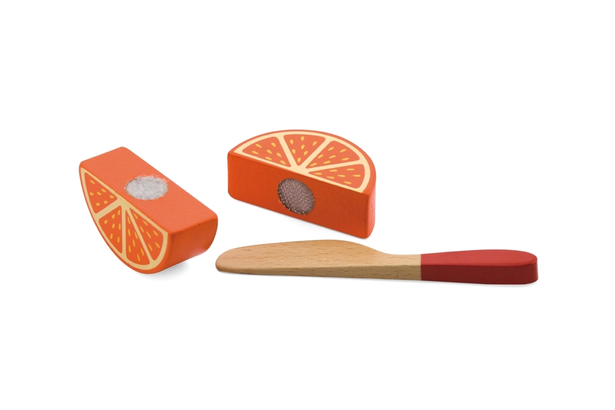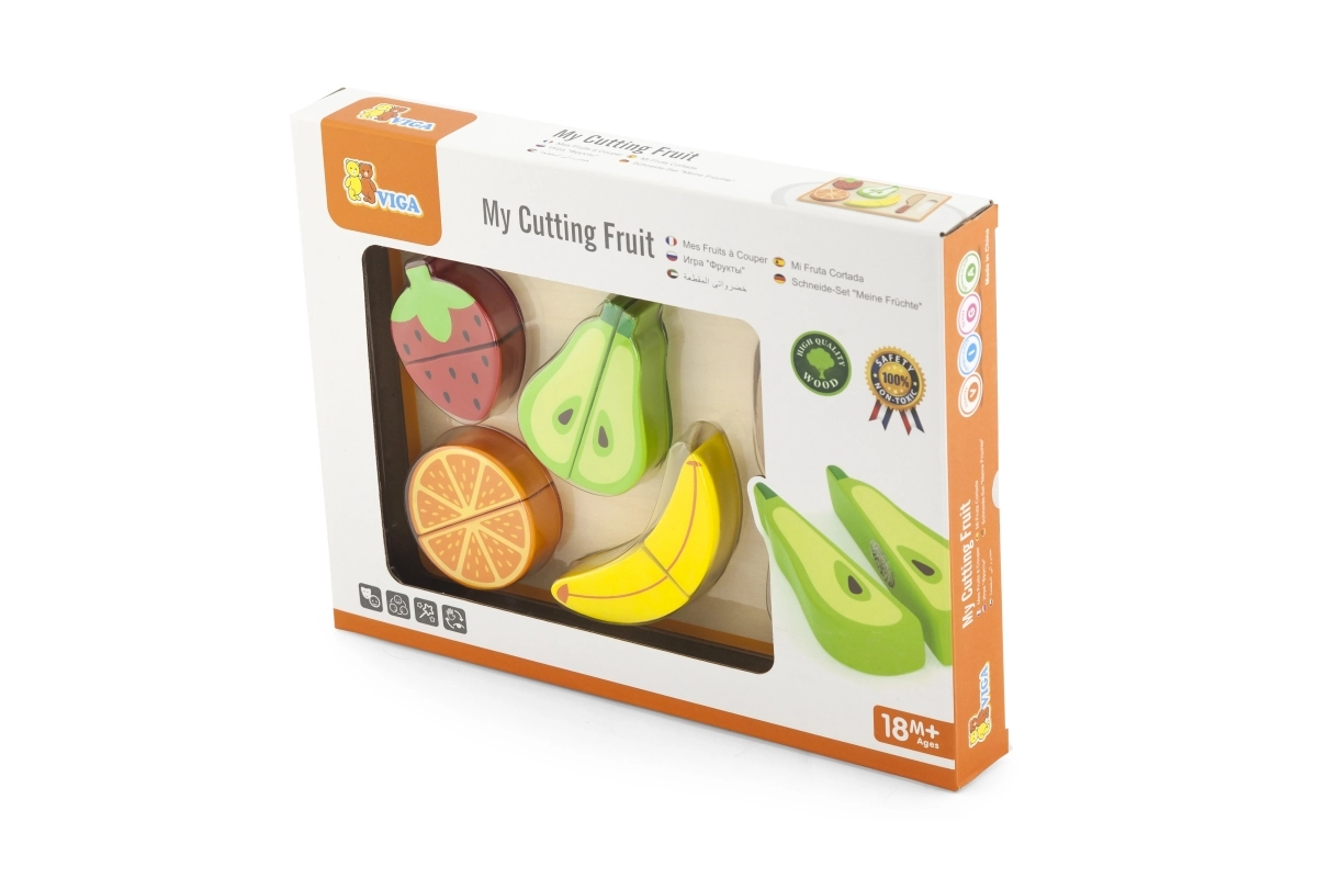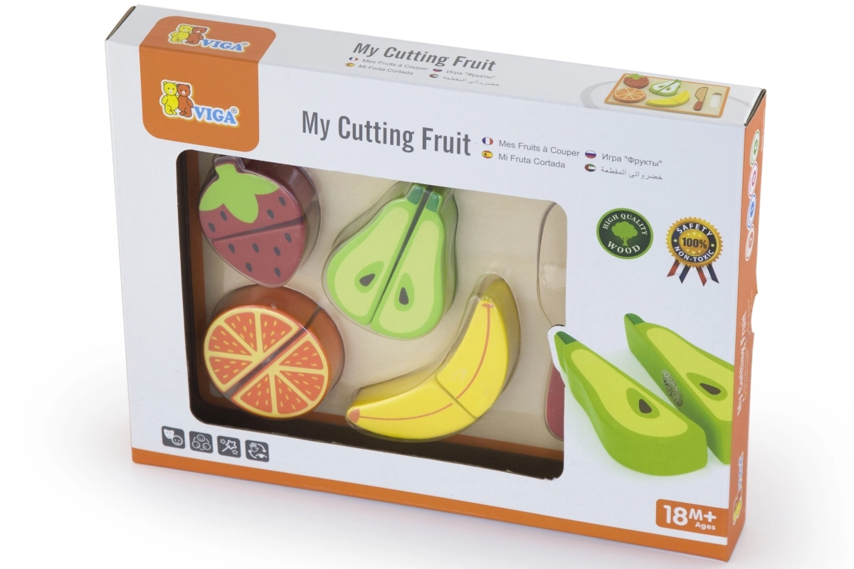 Šis kokybiškas medinis rinkinys siūlo saugų „virimo“ žaidimą: atskiros vaisių dalys sujungtos lipnia juostele, todėl vaikai gali jas pakartotinai „pjaustyti“ ir vėl sujungti. Dėl realistiško pateikimo vaikai mokosi atpažinti formas ir spalvas, lavina suėmimą bei koordinaciją ir skatina vaizduotę žaidžiant virtuvę.