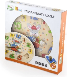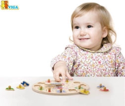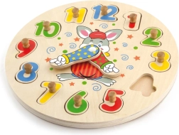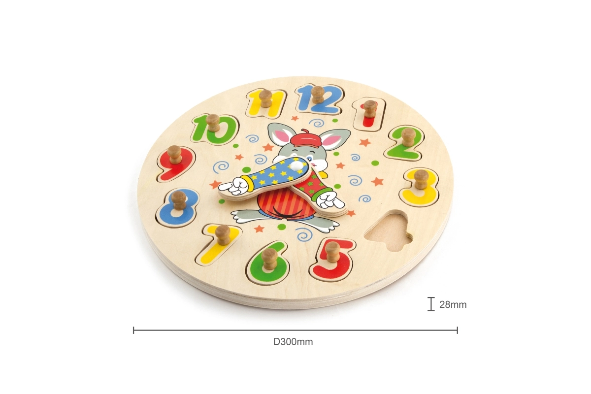 Šis medinis laikrodis sujungia dėlionę su laiko mokymusi. Spalvotos sunumeruotos detalės su praktiškomis rankenėlėmis puikiai tinka mažoms vaiko rankoms ir padeda atpažinti skaičius 1–12. Dėliodami vaikai lavina kantrybę, akių–rankos koordinaciją bei formų ir spalvų suvokimą.