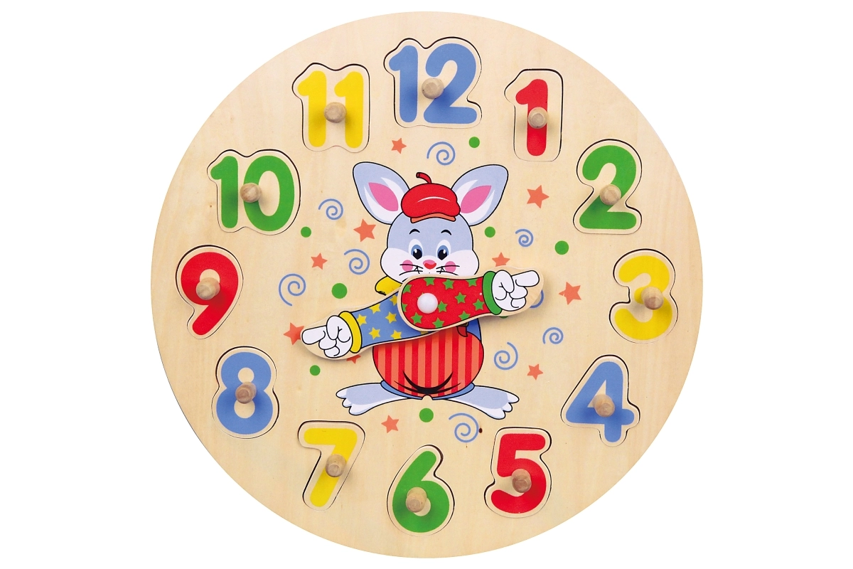 Smagus ir saugus medinis garsinis laikrodis, kuris taip pat tarnauja kaip dėlionė. Vaikai su 12 spalvotų detalių su rankenėlėmis mokosi skaičių 1–12 ir laiko nustatymo pagrindų, lavina smulkiąją motoriką, loginį mąstymą ir spalvų bei formų atpažinimą. Skersmuo apie 30 cm, tinka nuo 24 mėn.