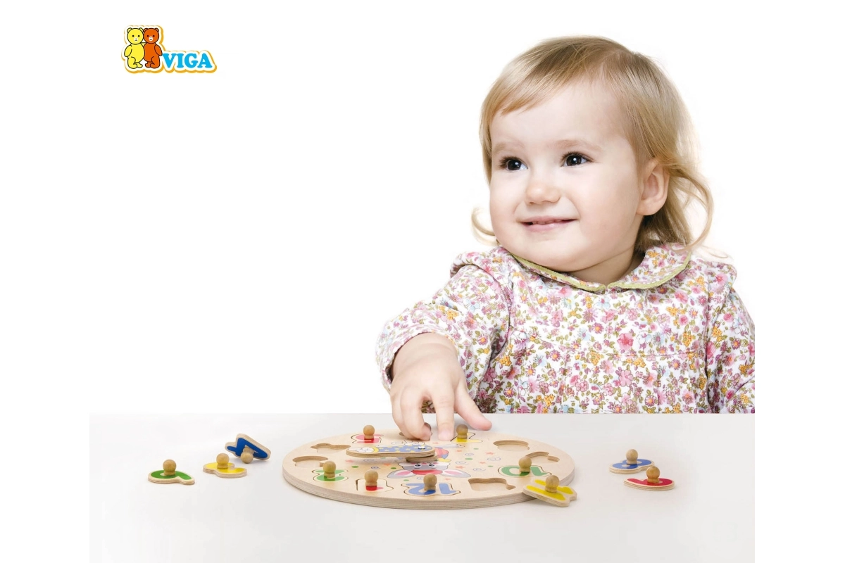 Kiekviena detalė turi medinį knopką patogiam suėmimui. Dėliodami vaikai lavina smulkiąją motoriką ir akių–rankos koordinaciją.