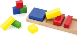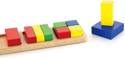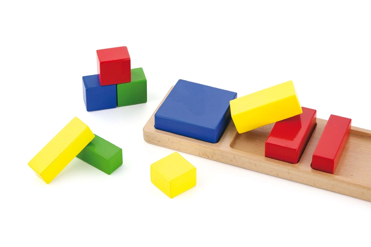 Dėl tvirtos medinės konstrukcijos šis žaislas suteikia ilgalaikį patvarumą ir saugumą vaikui žaidžiant. Spalvotas kaladėles galima lengvai įstatyti į iš anksto numatytas angas medinėje bazėje, taip mokant vaikus erdvinio suvokimo.