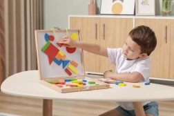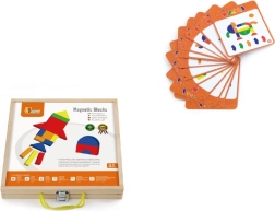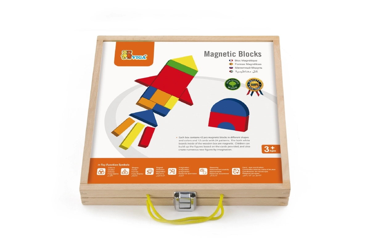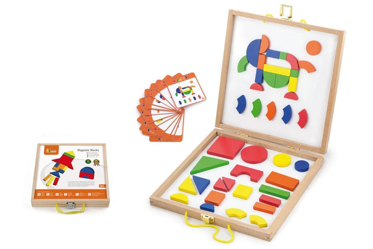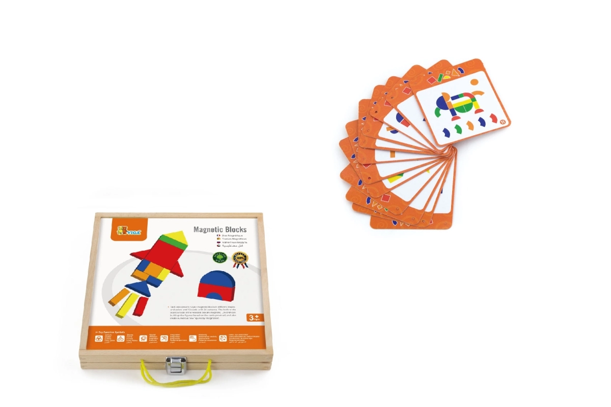Rinkinyje yra 42 medinės magnetinės detalės įvairių formų ir spalvų bei 12 dvipusių kortelių su iš viso 24 išradingais pavyzdžiais lengvam startui. Žaisdami vaikai lavina smulkiąją motoriką, akių–rankų koordinaciją, spalvų ir formų suvokimą bei erdvinį mąstymą.