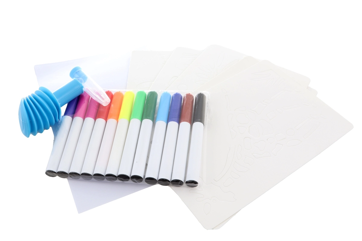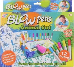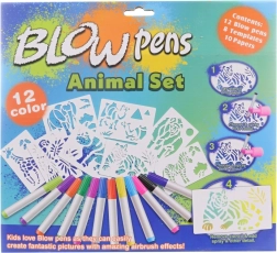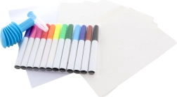 12 spalvotų flomasterių, 8 trafaretai, 6 lapai, kartoninis stovas su laikikliu, pučiamas antgalis su pompą