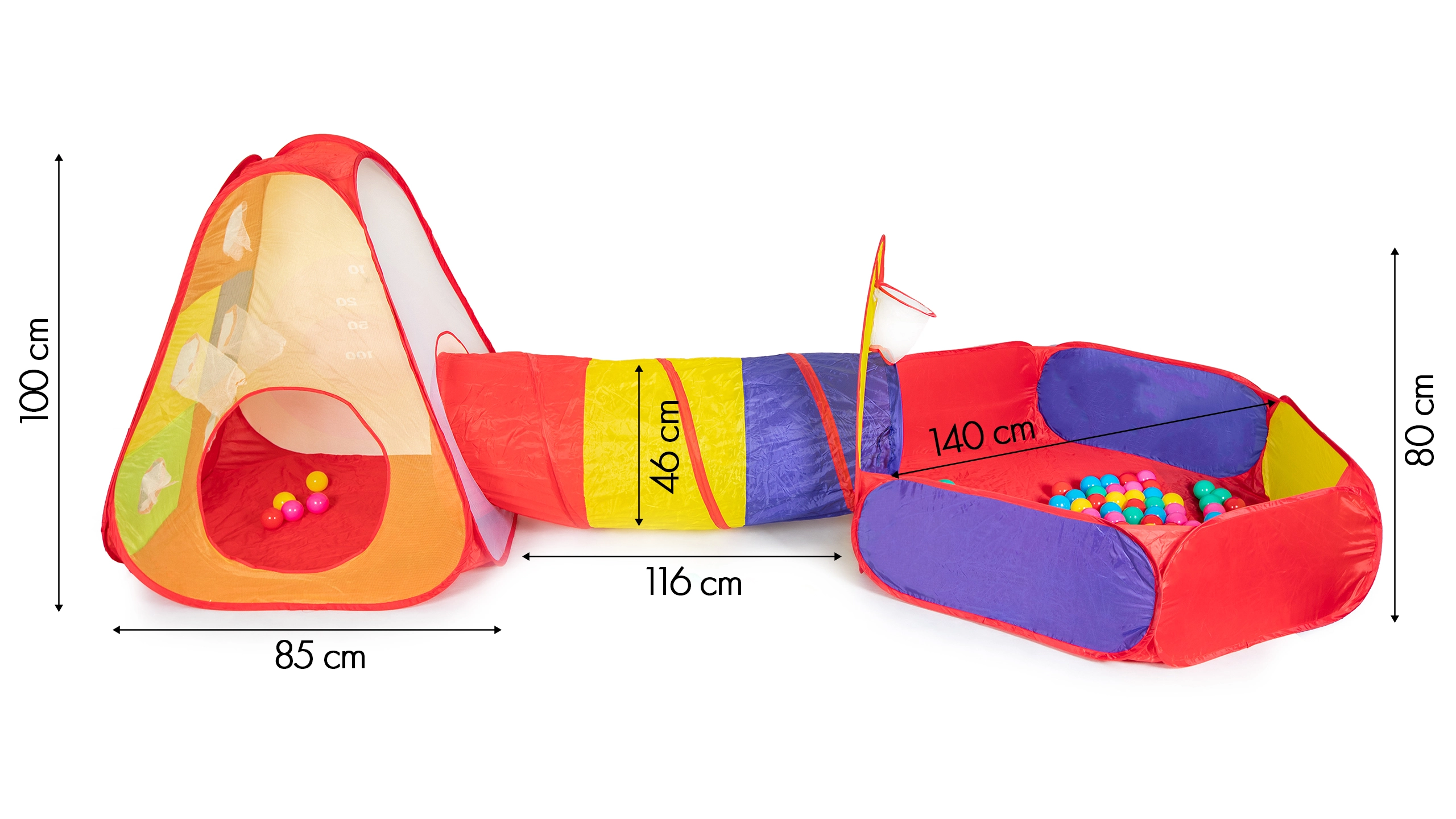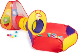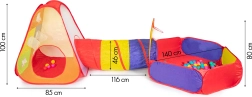 - Palapinė, tunelis, sausas baseinas, 100 plastikinių kamuoliukų, 3 lipnūs kamuoliukai su velcro