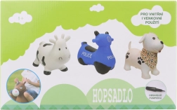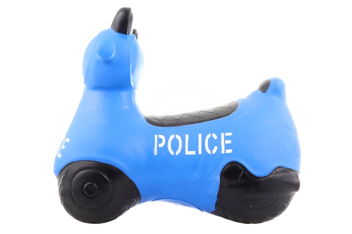 Linksmas guminis šokinėjimo žaislas motociklo formos su policijos motyvu vaikams nuo 1 metų. Skatina pusiausvyros, stambiosios motorikos ir koordinacijos lavinimą, yra stabilus, patvarus ir lengvai valomas. Į pakuotę įeina pompa greitam pripūtimui.