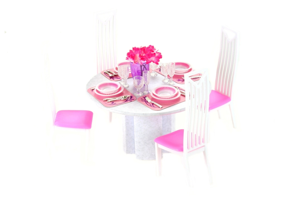 Stilingas Glorie valgomojo rinkinys lėlėms pavers kiekvieną vaikų žaidimą realistiška puota. Rinkinyje yra apvalus stalas, 4 kėdės ir 4 pilni valgomojo serviso rinkiniai. Idealu kūrybiniam žaidimui ir vaikų vaizduotei lavinti nuo 3 metų.