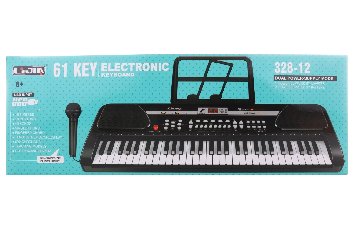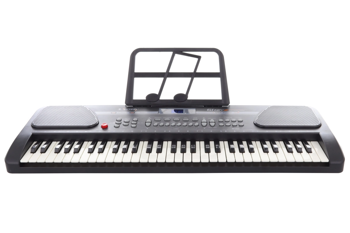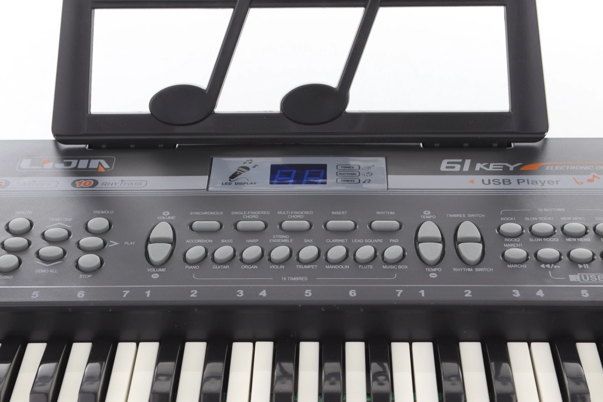 Plastikinis elektroninis pianinas su 61 klavišu yra puikus pasirinkimas vaikams ir pradedantiesiems, norintiems lavinti muzikinę klausą ir ritmą. Dėka įmontuotų funkcijų, tokių kaip įvairios pritarimo melodijos ir instrumentų garsų pasirinkimas, lengvai sukursite savo muzikinius pasirodymus.