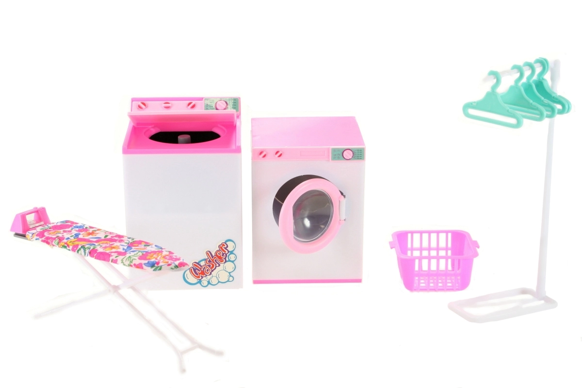 • Rinkinio turinys: skalbimo mašina (atidaromas priekinis dangtis), džiovyklė (atidaromas viršutinis dangtis), lyginimo lenta, lėlių lygintuvas, drabužių stovas su 5 pakabomis, skalbinių krepšelis