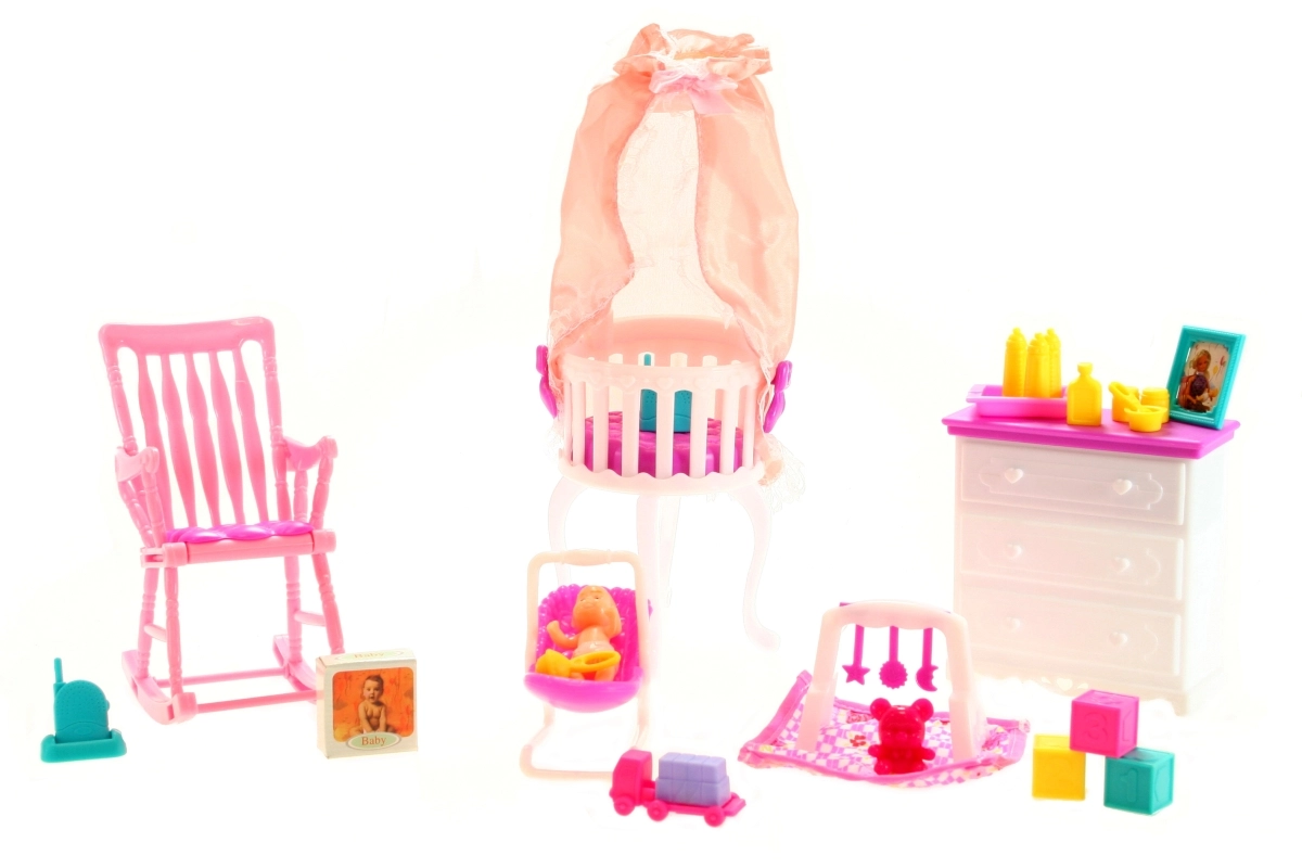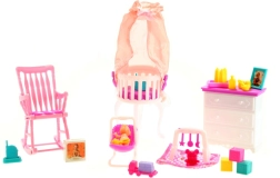 Šis gausiai sukomplektuotas rinkinys kiekvieną žaidimą paverčia realistiška patirtimi. Vaikai gali įrengti savo kūdikio kampelį, sudėti smulkmenas į komodą, paguldyti kūdikį į lovelę su baldakimu ir suptis stilingame krėsle. Rinkinys puikiai skatina kūrybišką žaidimą, smulkiosios motorikos ugdymą ir vaidmenų žaidimą.