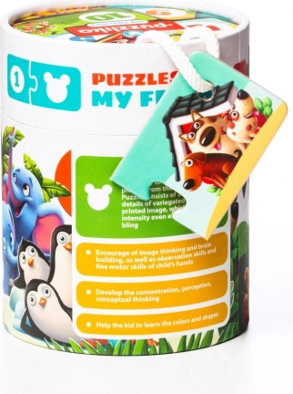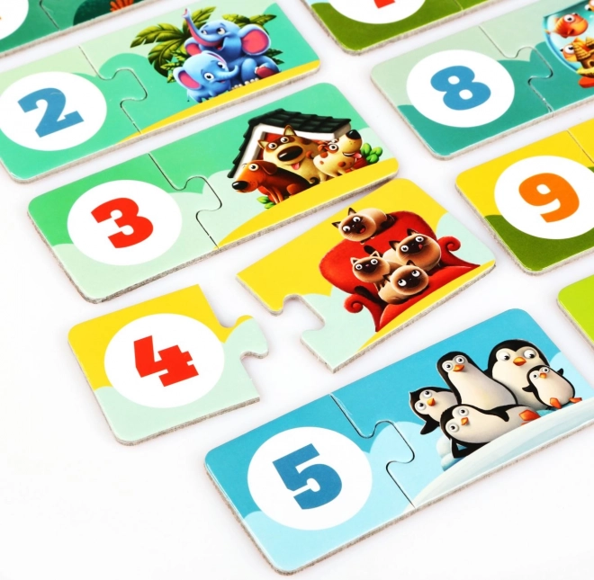 Linksmas mokomasis rinkinys patiems mažiausiems: iš 20 tvirtų detalių sudaryta 10 porų, kurias vaikai jungia pagal gyvūnėlių skaičių ir skaitmenis 1–10. Žaidimas lavina loginį mąstymą, smulkiąją motoriką ir skaičių pažinimą, pagamintas iš patvaraus daugiasluoksnio kartono ir lengvai prižiūrimas nuvalant drėgna šluoste.