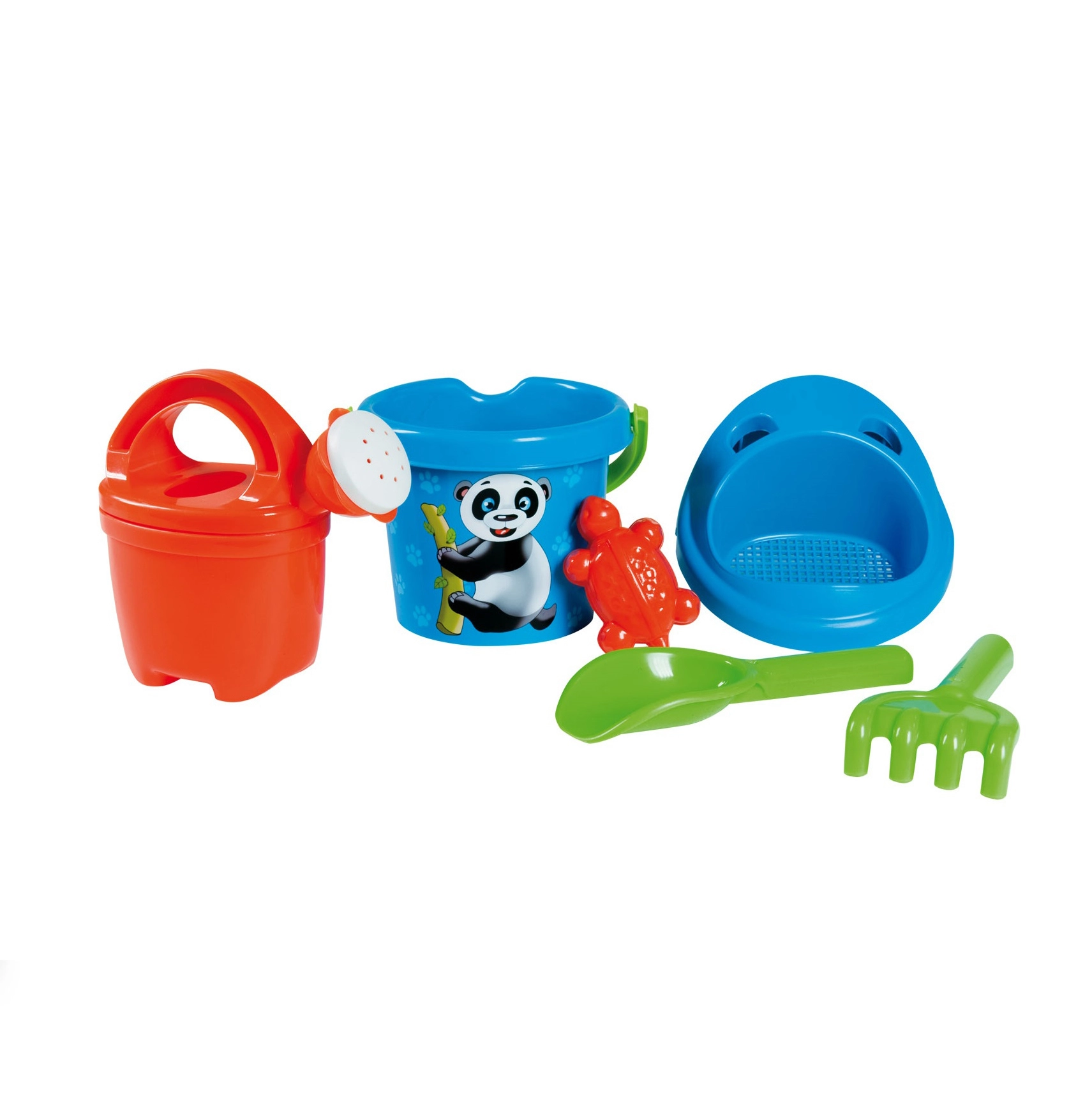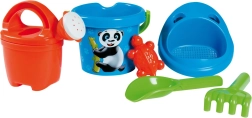Žavus 6 dalių smėlio rinkinys ANDRONI su pandos motyvu pradžiugins mažus statytojus paplūdimyje ir smėlio dėžėje. Pagamintas Italijoje iš kokybiško plastiko, saugus nuo 12 mėnesių ir turi viską, ko reikia: kibirėlį (Ø 13 cm, aukštis 11 cm), laistytuvą 0,5 l, sietelį, semtuvėlį, grėbliuką ir formelę vėžliuko pavidalo.
