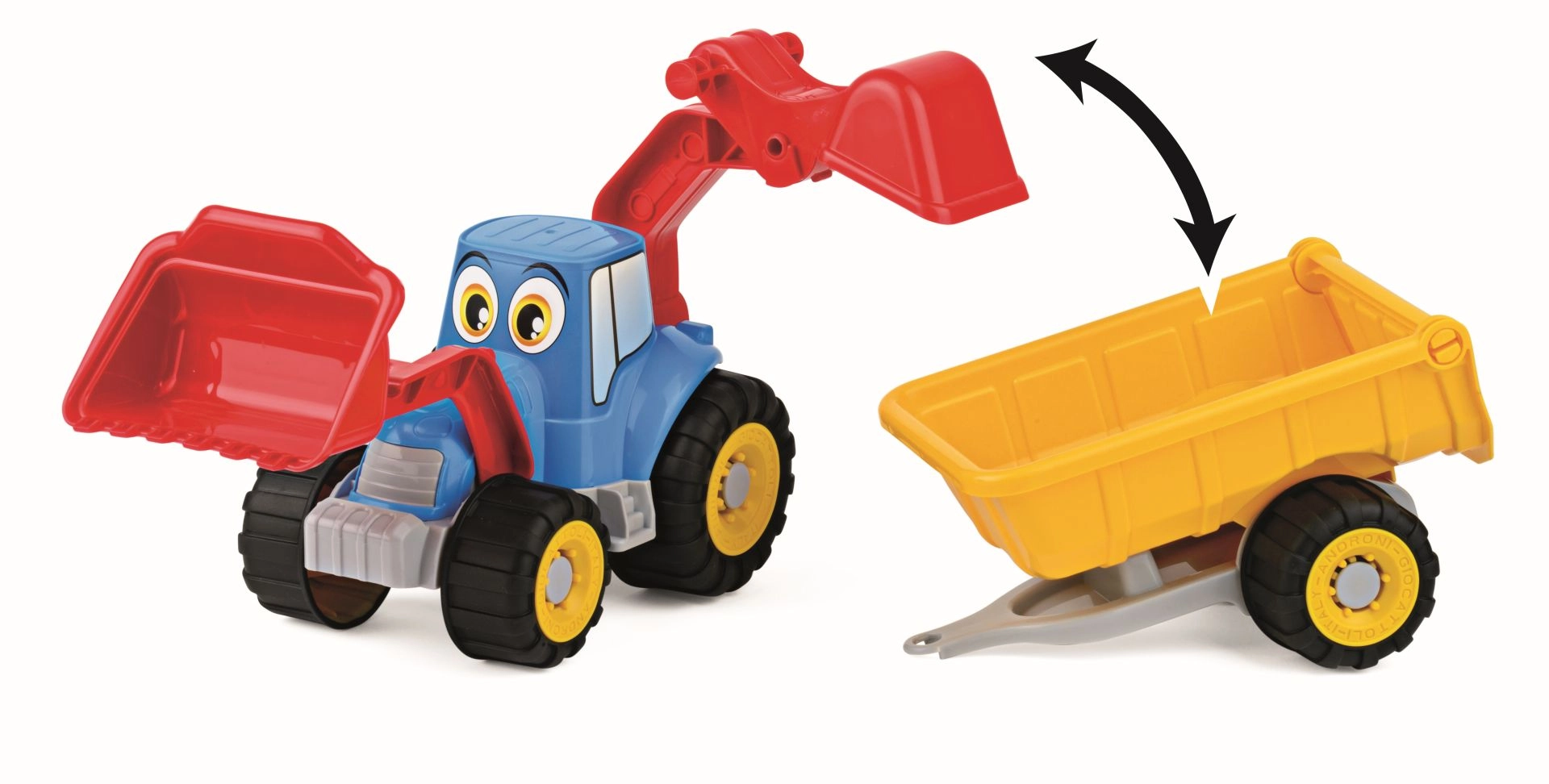 Šis linksmas ANDRONI traktorius su tikro darbinio įrenginio funkcijomis suteikia vaikams valandas kūrybiško žaidimo. Priekinis krautuvas ir galinis kasimo kaušas leidžia semti smėlį ar kaladėles, o priekaba su nuleidžiamu galu palengvina krovinio iškrovimą. Gumuoti ratai užtikrina tylesnį ir saugesnį važiavimą įvairiais paviršiais.
