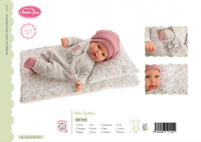 Atraskite žaidimo žavesį su ANTONIO JUAN prekės ženklo lėle Kika – žavia, realistine lėle su verkimo garsais ir magnetiniu čiulptuku, kuri, ištraukus čiulptuką, skleidžia tikro kūdikio garsus. Ji turi minkštą medžiaginį kūną glostymui, švelnias vinilines galūnes ir pateikiama dovanų dėžutėje. Tinka nuo 3 metų.