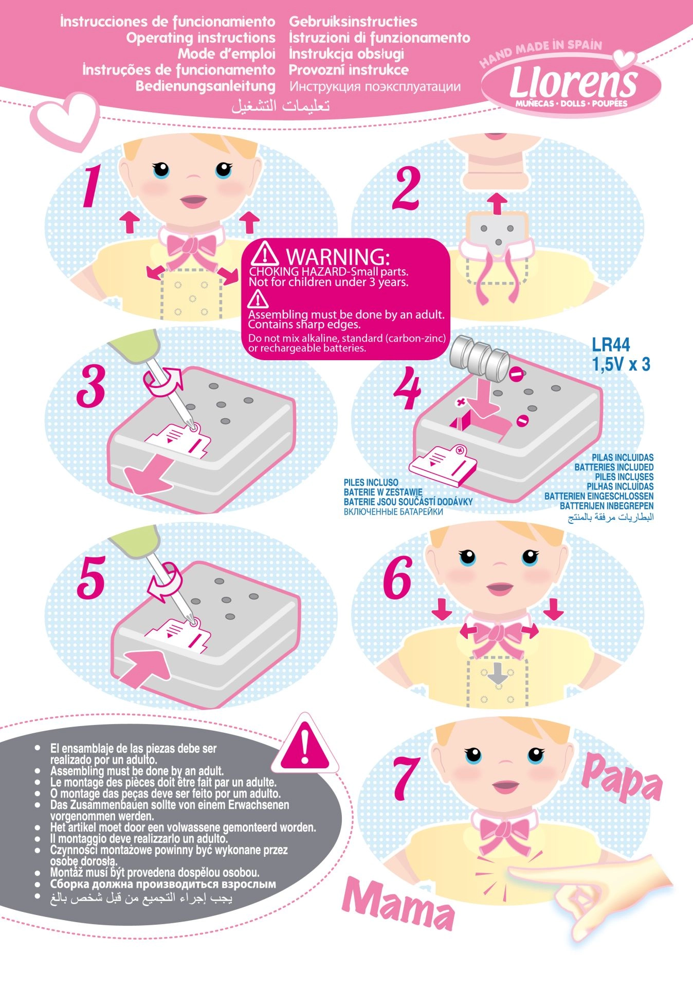 Paspaudus krūtinę, lėlytė imituoja tikrą kūdikį juoku ir žodžiais „mama“ bei „tėtis“.