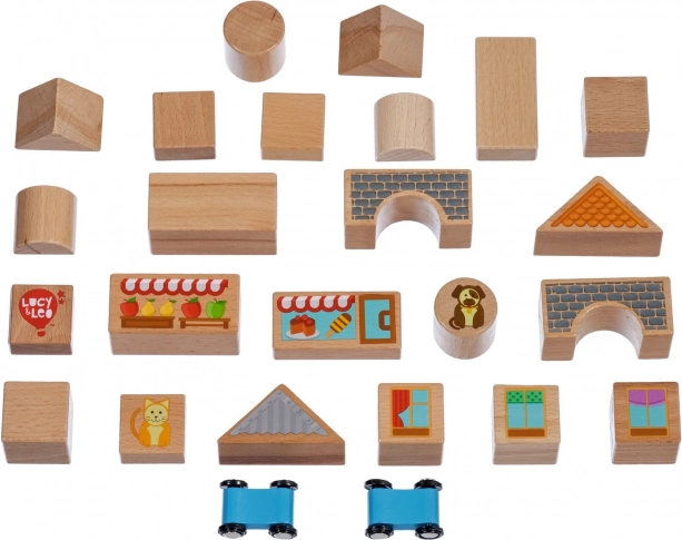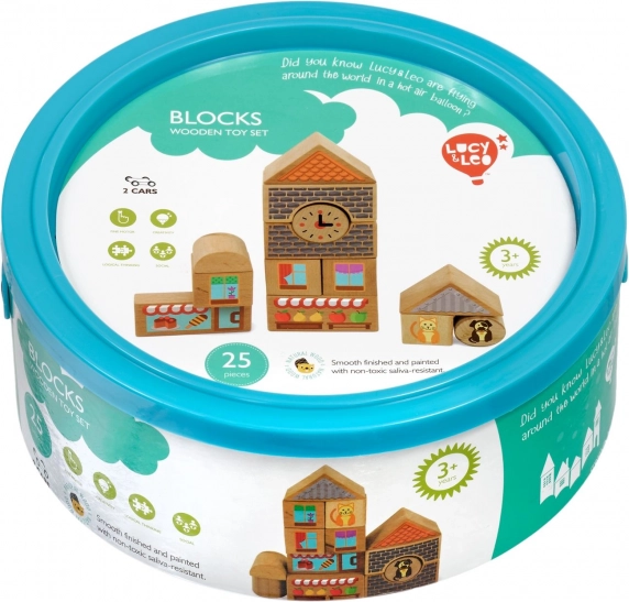 Atraskite kūrybinio statymo žavesį su Lucy & Leo miesto medinių kaladėlių rinkiniu. Rinkinyje yra 25 aukštos kokybės medinės dalys, įskaitant 2 riedančius automobiliukus, įvairių formų ir spalvų, skirtų nameliams ir gatvelėms statyti. Iliustruoti elementai, tokie kaip langai, stogai ir parduotuvių vitrinos, skatina vaizduotę ir teminį žaidimą. Žaislas lavina smulkiąją motoriką, loginį mąstymą ir kūrybiškumą, o po žaidimo viską lengvai sudėsite į praktinę apvalią dėžę su dangčiu ir rankena.