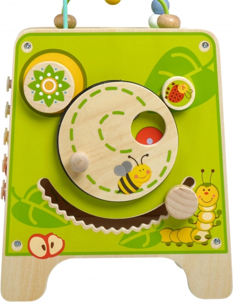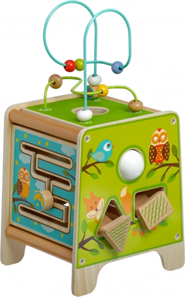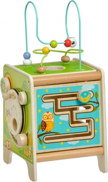 Šis spalvingas medinis aktyvus kubas suteikia vaikams valandų valandas prasmingo žaidimo. Viršuje esantį karoliukų labirintą galima išimti ir apversti į kubo vidų patogiam laikymui. Ant šonų vaikai ras ksilofoną su plaktukais, dviejų dalių sukamų geometrinių formų dėliojimą, motorinį labirintą, besisukantį ratuką, pasukamus elementus ir linksmą žaidimą su slankiojančiu kaišteliu griovelio takeliu.