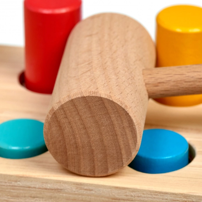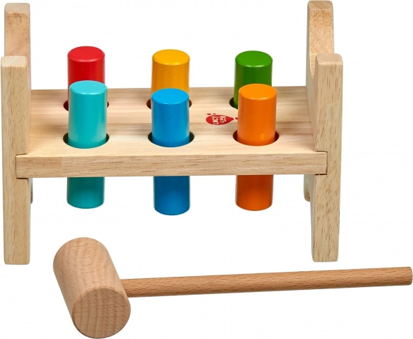 Šeši spalvoti kaiščiai ir medinis plaktukas moko vaikus tikslaus suėmimo, smūgio jėgos ir rankos–akies koordinacijos.