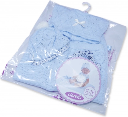 26 cm dydžio kūdikio lėlytės drabužėlių rinkinį sudaro megztukas, kepuraitė ir kelnaitės. Jis sukurtas taip, kad suteiktų maksimalų patogumą ir eleganciją žaidžiant su lėle. Pakuotėje taip pat yra švelniai megzta antklodėlė, kuri papildo bendrą įvaizdį. Šis rinkinys supakuotas į permatomą pakuotę su plastikine arba kartonine pakaba.