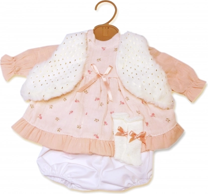 - Pilnas aprangos komplektas 42 cm lėlei: suknelė, liemenė ir kelnaitės