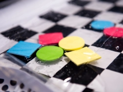 Kilimėlis pripildytas vandeniu ir turi spalvotas figūras, kurios juda palietus ir skatina lytėjimo raidą.