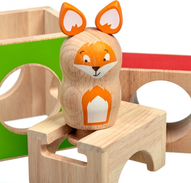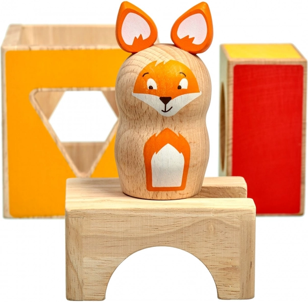 3 medinės kaladėlės su išpjovomis, medinė lapės figūrėlė, užduočių kortelių rinkinys