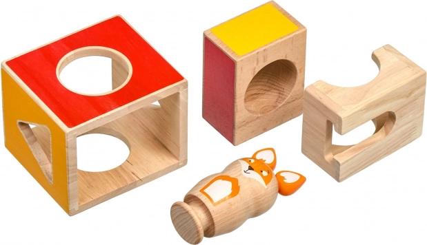 Šis medinis edukacinis žaidimas apima tris masyvias kaladėles su įvairių formų išpjovomis, medinę lapės figūrėlę ir abipuses skirtingo sudėtingumo užduočių korteles. Vaikai pagal pavyzdžius stato ir derina kaladėles taip, kad lapė teisingai „pasislėptų“, taip treniruodami strategiją ir erdvinį suvokimą.