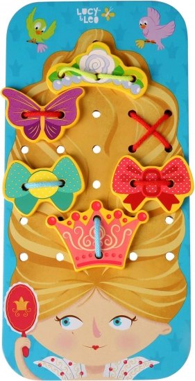Atraskite kūrybišką medinį veriamosios juostelės rinkinį Princesė iš Lucy & Leo – linksmą žaislą, lavinantį smulkiąją motoriką, kūrybiškumą ir loginį mąstymą. Vaikai puošia princesės plaukus spalvingais aksesuarais vėrimo būdu ir tuo pačiu lavina akių–rankų koordinaciją, spalvų pažinimą bei formų atpažinimą. Puikus pasirinkimas kaip Montessori priemonė ikimokyklinukams.