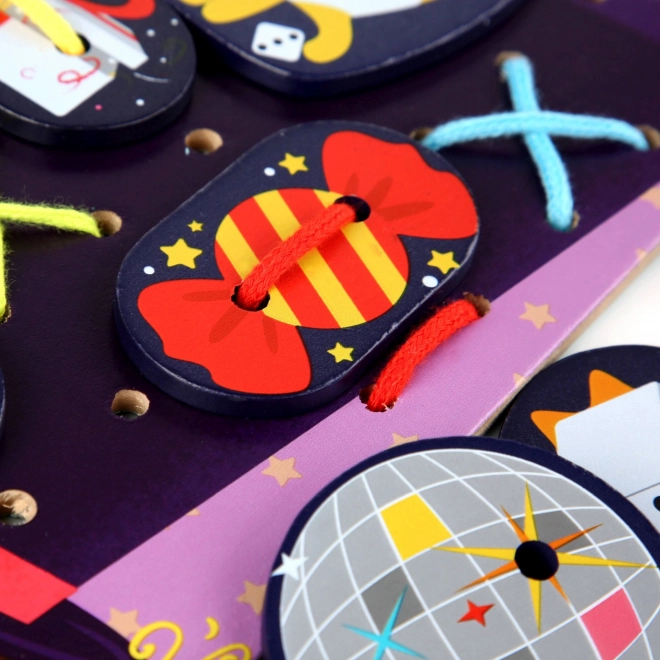 Šis smagus vėrimo ir pervėrimo rinkinys su burtininko motyvu kviečia vaikus į fantazijos pasaulį. Prie didelės plokštės su burtininko galva ir jo skrybėle vaikai gali raišteliais tvirtinti spalvingus priedus – nuo triušio ir monetų iki paslaptingų kortų. Žaisdami vaikai lavina akių–rankų koordinaciją, kantrybę ir kūrybiškumą.