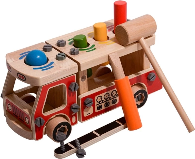 Šis kūrybinis rinkinys sujungia konstruktorių ir kaladėlių kalimo žaidimą viename. Vaikai pirmiausia surenka tvirtą medinę gaisrinę mašiną, o tuomet jos kėbule esančias keturias angas naudoja linksmam spalvotų elementų kalimui plaktuku. Ryškios spalvos ir įvairios formos skatina natūralų mokymąsi ir susikaupimą.