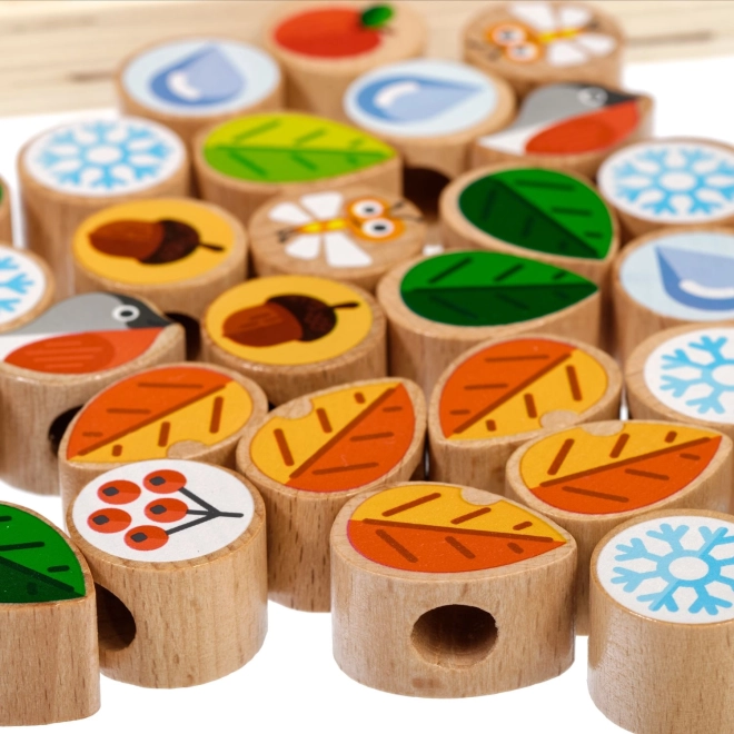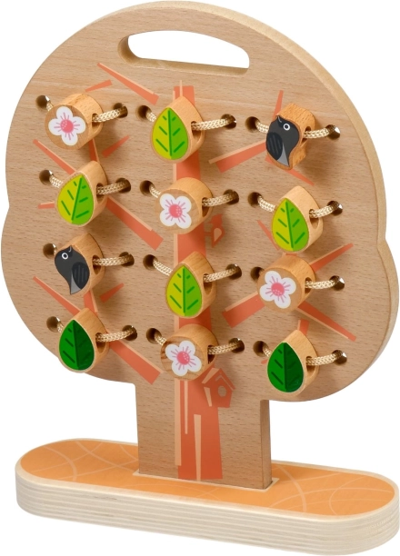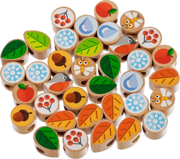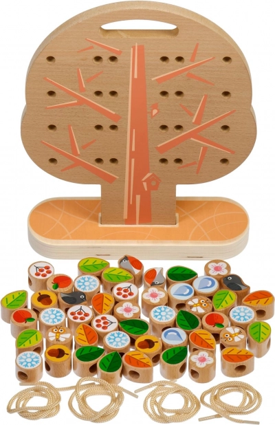 Šis kokybiškas medinis rinkinys suteikia vaikams smagų vėrimą ir raišiojimą ant tvirtos medžio plokštės su stovu. Rinkinyje yra spalvotos detalės (lapai, žiedai, uogos, giles, vaisiai, snaigės, vabzdžiai ir kt.) ir kelios virvutės begalinėms variacijoms. Po žaidimo detales galima sudėti į praktišką lininį maišelį.