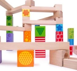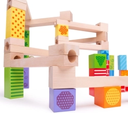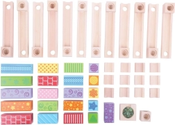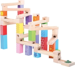 Ši medinė rutuliukų trasa idealiai tinka kūrybingiems vaikams, mėgstantiems statyti savo trasas. Rinkinyje yra 53 detalės, leidžiančios sukurti daugybę variacijų ir dizainų pagal vaiko vaizduotę.