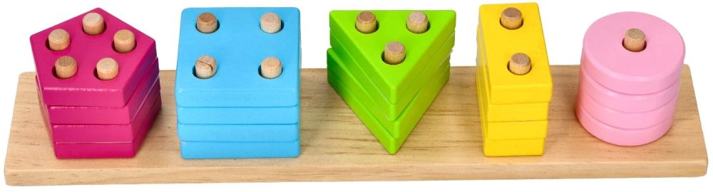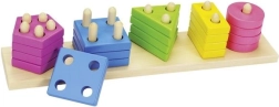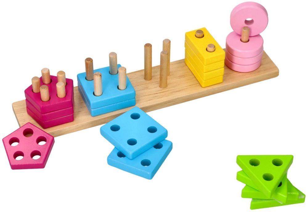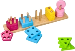 Ši medinė rūšiavimo dėlionė jungia spalvų ir geometrinių formų mokymąsi su praktiniu detalių movimu ant kaiščių, turinčių skirtingą skylių skaičių. Žaisdami vaikai lavina smulkiąją motoriką, griebimą, akių–rankų koordinaciją ir loginį mąstymą.