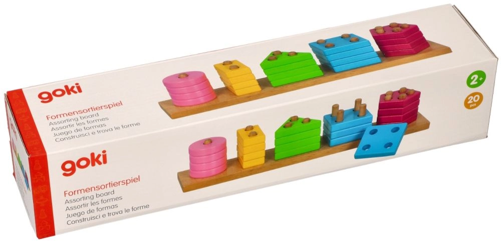 Smagi medinė dėlionė jungia spalvų ir formų rūšiavimą su detalių movimu ant kaiščių, turinčių skirtingą skylių skaičių. Lavina smulkiąją motoriką, akių–rankų koordinaciją ir loginį mąstymą, pagaminta iš masyvios medienos saugiam ir ilgaamžiam žaidimui.