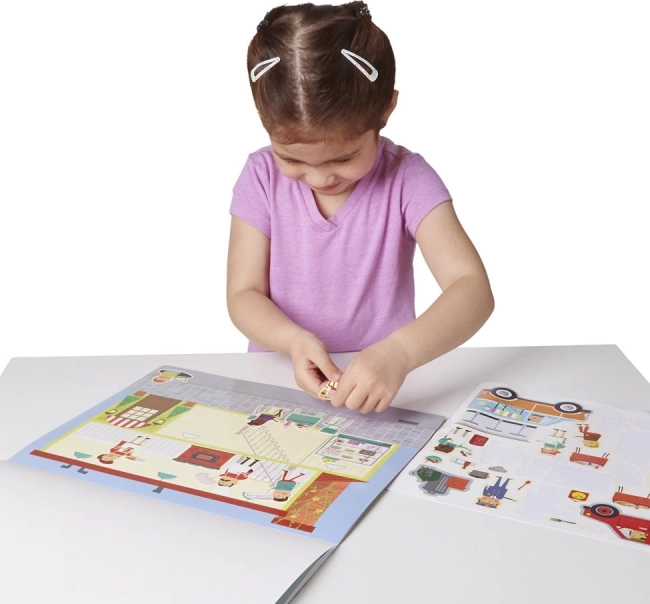Kiekviename rinkinyje yra daugkartinio naudojimo lipdukai, kuriuos lengva perkelti ir vėl užklijuoti, todėl vaikai gali kurti begalines scenų variacijas.