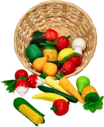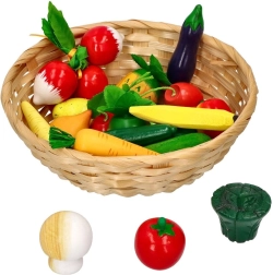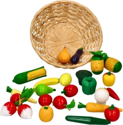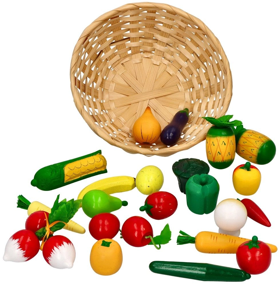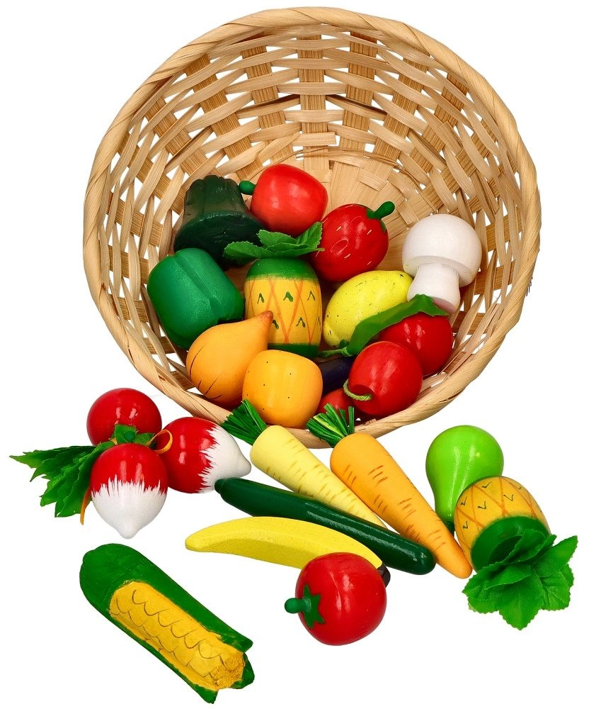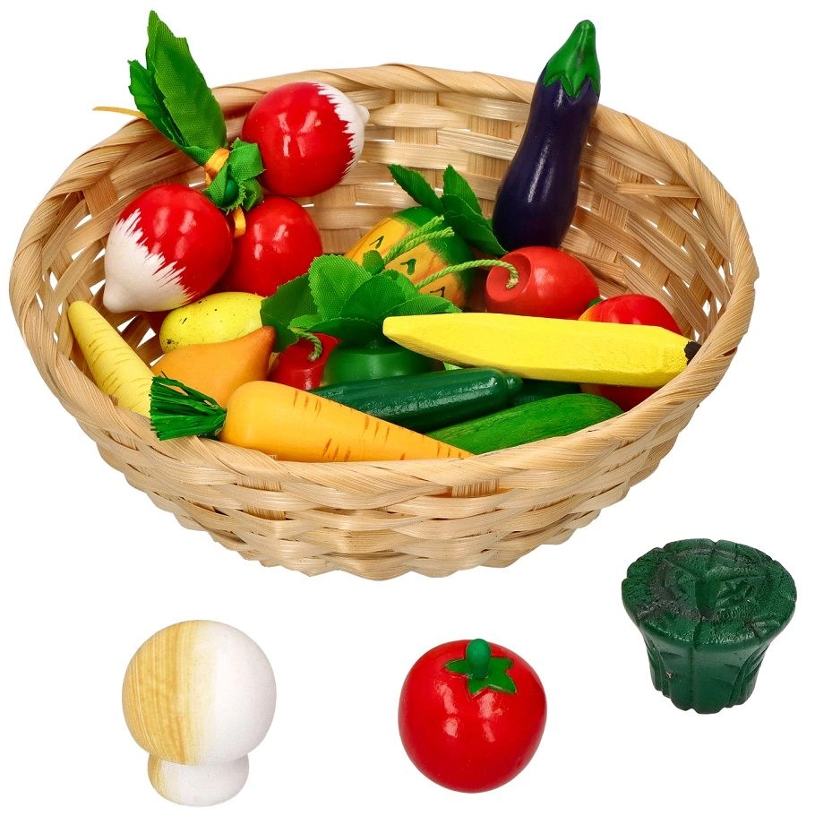 Šis spalvingas medinių maisto produktų rinkinys krepšelyje yra puikus papildymas vaikų virtuvei ir parduotuvės žaidimams. Realistiškai nudažytos detalės, tokios kaip morka, kukurūzas, pomidoras ar bananas, skatina vaikus tyrinėti, rūšiuoti ir įvardyti. Patvarus medis užtikrina ilgaamžiškumą ir saugų žaidimą.