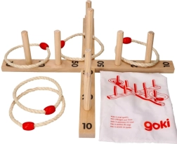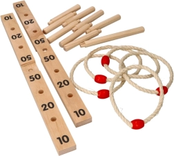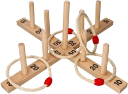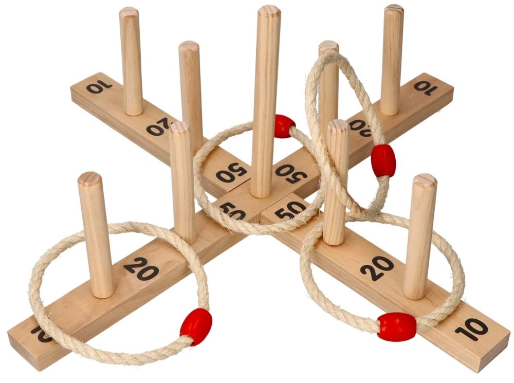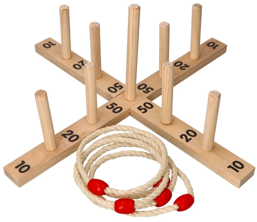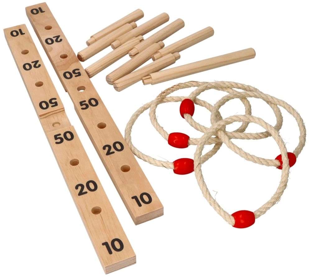 Šiame rinkinyje yra kryžminė bazė su 9 mediniais stulpeliais ir penki virviniai žiedai su mediniu elementu lengvam mėtymui. Žaidimas pagamintas iš kokybiškos medienos, kuri užtikrina ilgalaikį smagumą.