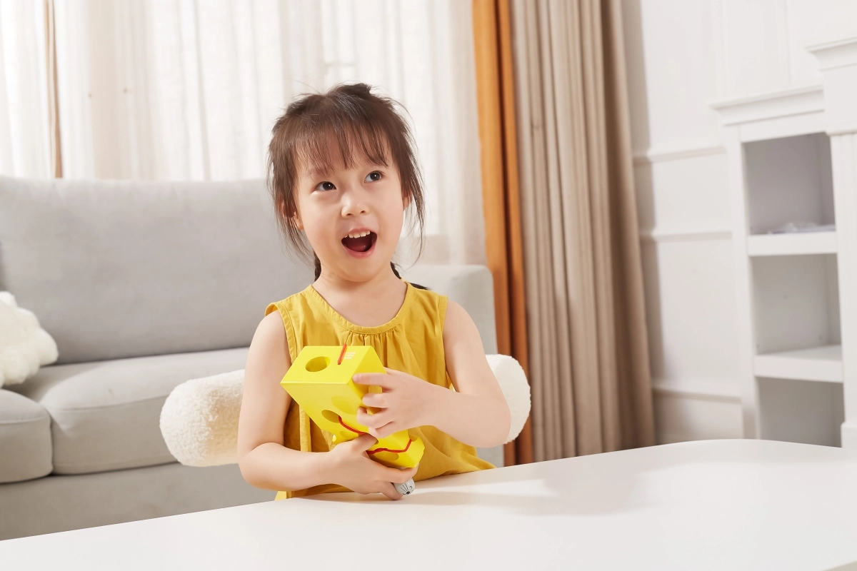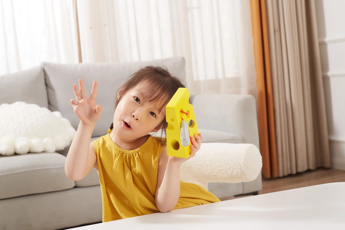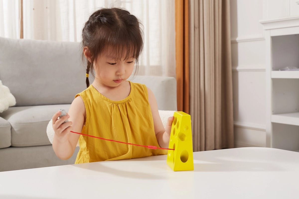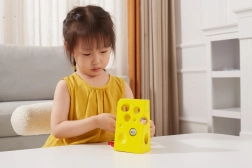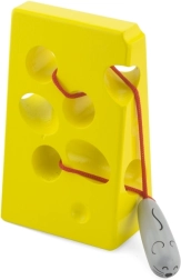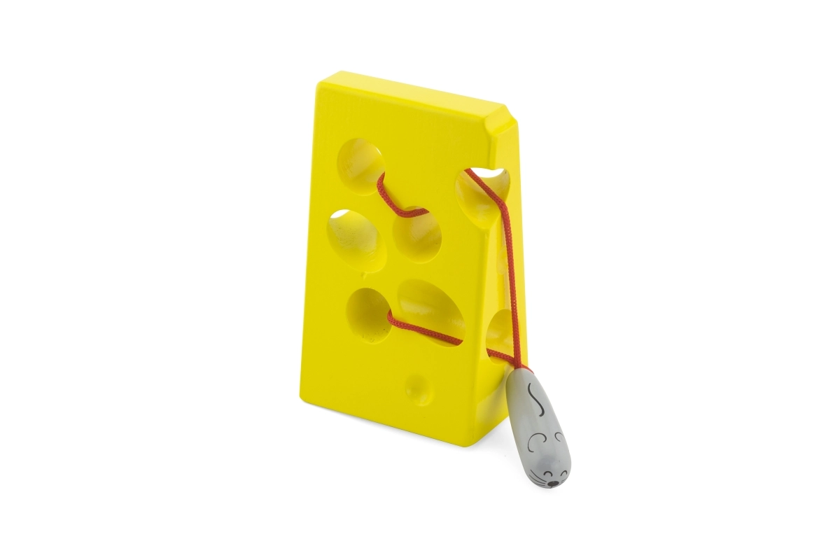 Šis geltonas „sūris“ su skylutėmis ir raudona virvele su pelyte motyvuoja vaikus linksmai mankštinti pirštukus. Vėrimas per įvairiose vietose esančias skylutes skatina rankų miklumą, judesių simetriją ir loginį mąstymą.